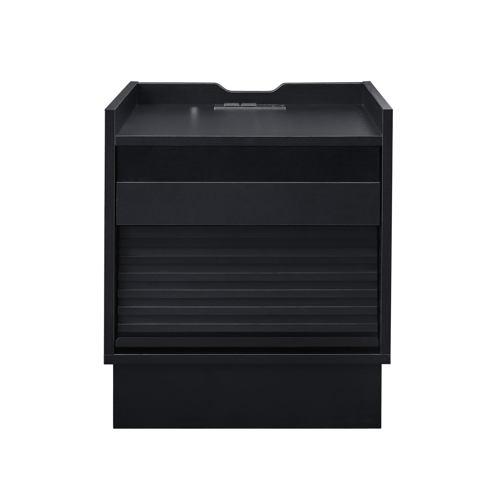 Bring mid-century style and modern convenience to your bedroom or living room with this sleek black nightstand. Clean lines and tapered legs offer classic retro appeal while thoughtful tech and storage features—built-in charging, customizable LED drawer lighting, and two roomy drawers—make it a practical bedside companion for sleeping, reading, and relaxing.