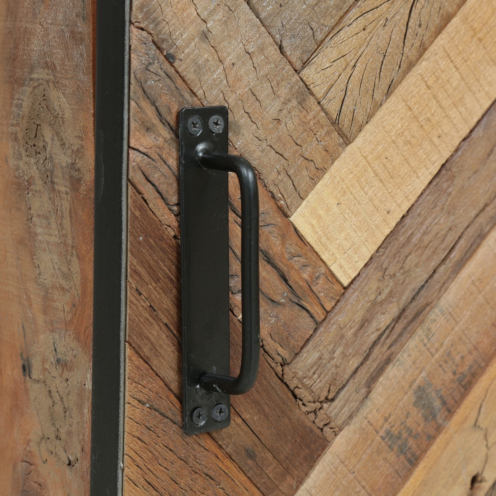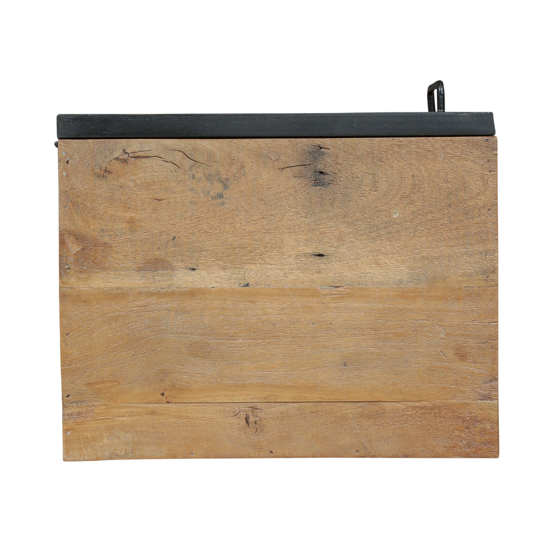 - Materials: Top and front—recycled wood; frame and handle—iron/metal.