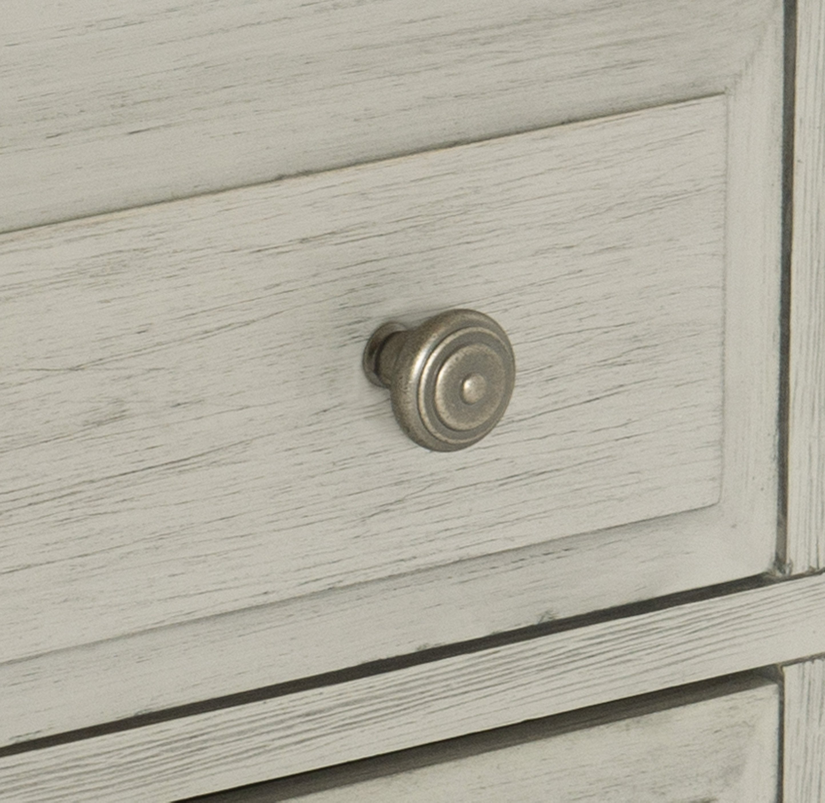 - Design: Modern farmhouse profile with clean lines, an open display shelf, and antique pewter-tone knobs for subtle vintage character.