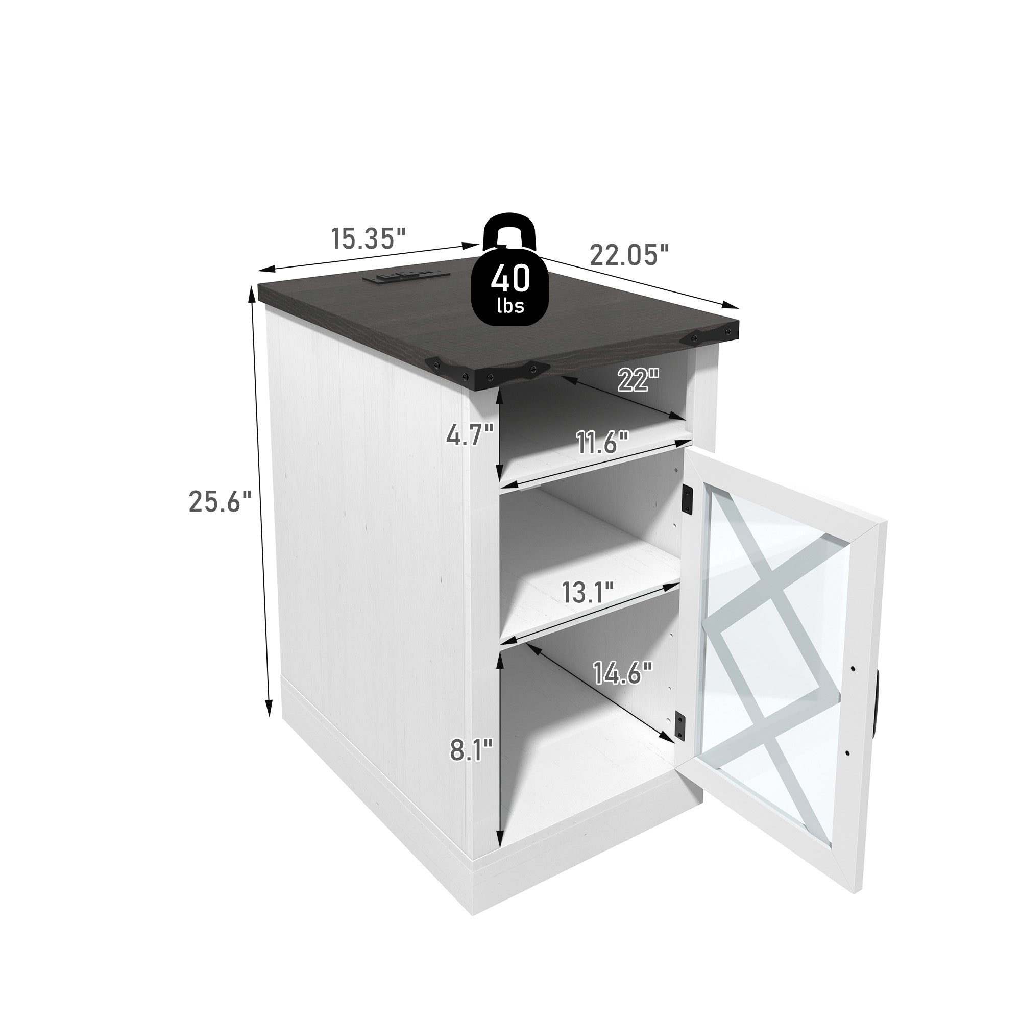 - Charging Station Table: 2 AC outlets, 2 USB ports, cord holes for neat charging of devices.