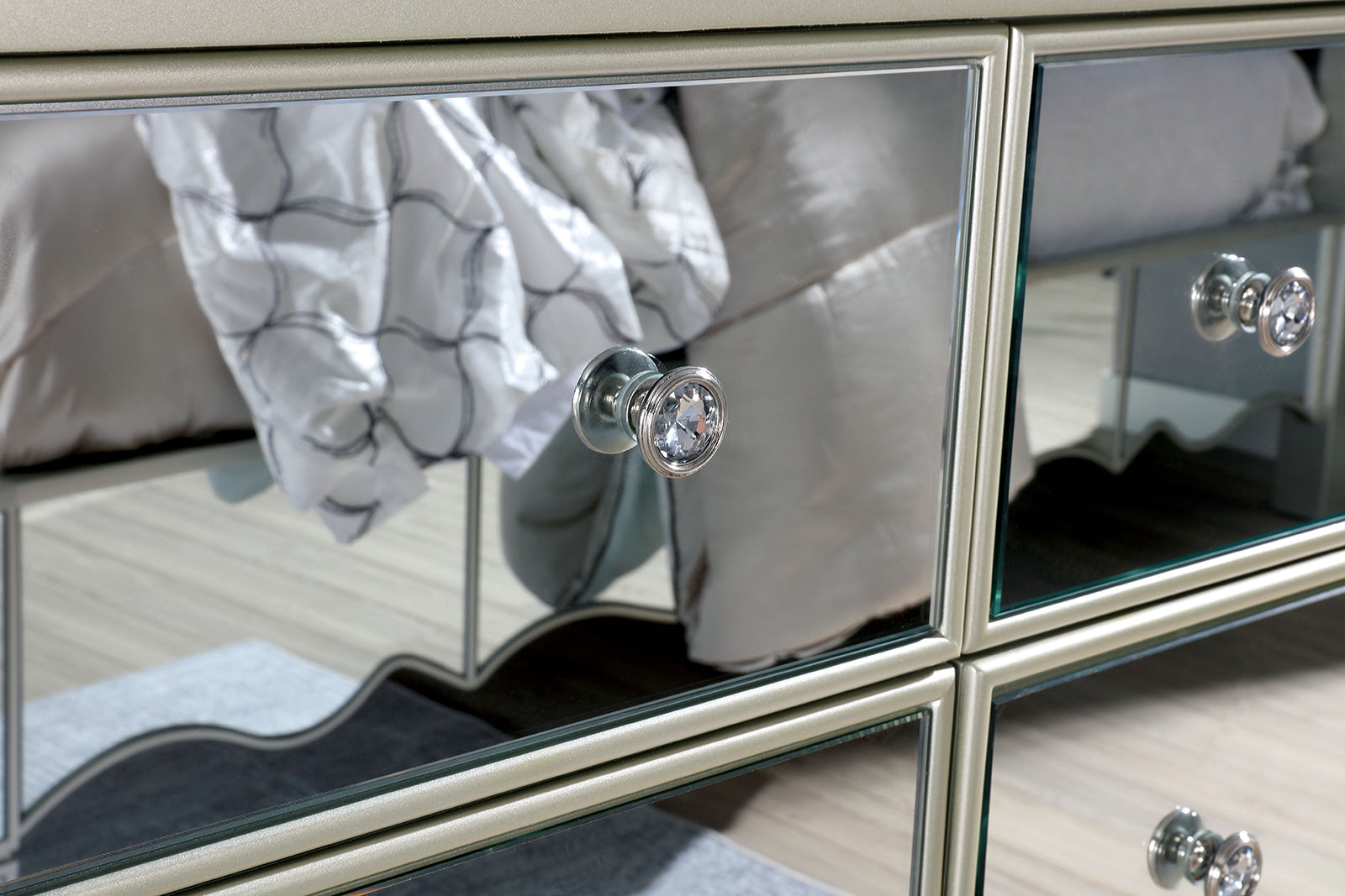 - Hardware: Faceted crystal drawer knobs catch the light and add refined sparkle to the piece.