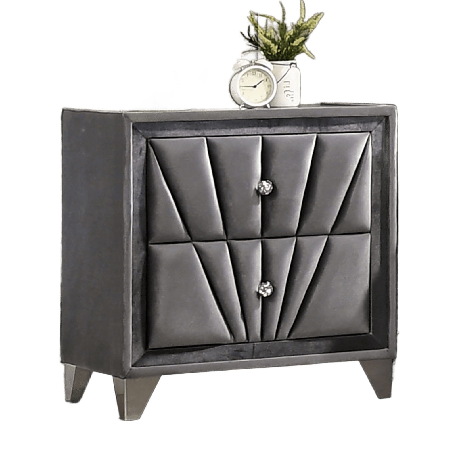 Bring Old Hollywood glamour to your bedroom with this Art Deco–inspired fully upholstered nightstand. Wrapped in soft gray fabric and accented with chrome legs and crystal-like drawer pulls, it pairs vintage curves with modern functionality to create a statement piece that elevates any bedside. The plush upholstered frame and glass top add tactile luxury while durable construction ensures everyday usability.