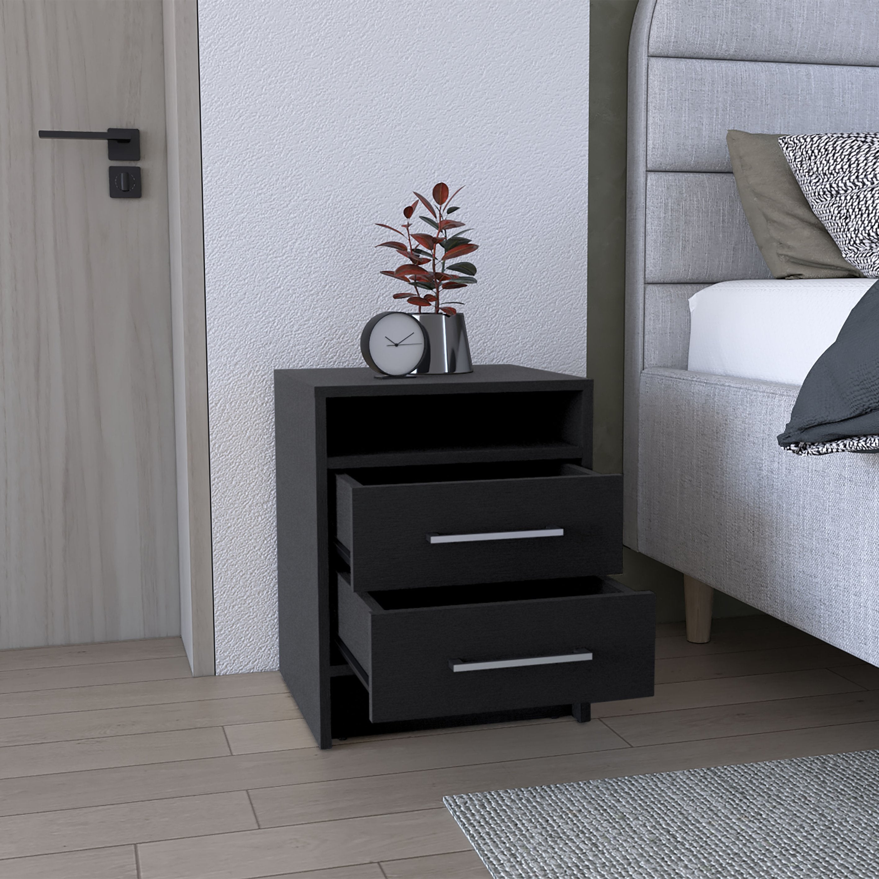 Enhance your bedroom or living area with a compact, modern nightstand that combines streamlined style with practical storage. This black two-drawer nightstand with an open center shelf maximizes organization in a small footprint while adding a contemporary accent to your decor.