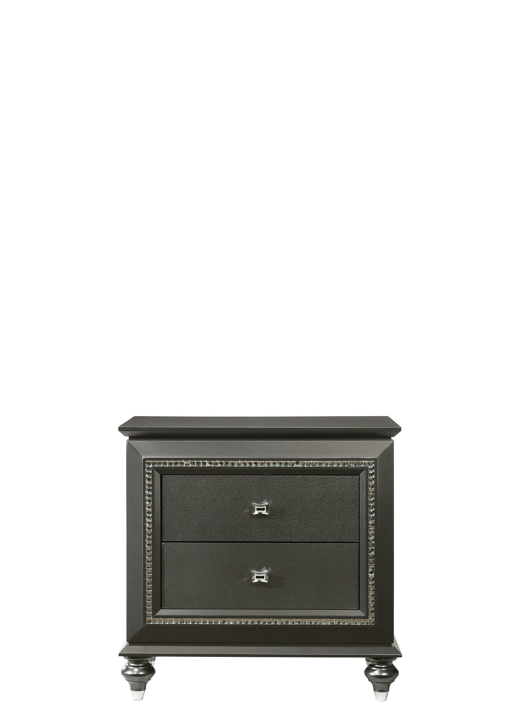 Add a touch of modern glamour to your bedroom with this metallic gray nightstand that blends classic silhouette details and sparkling accents for a refined, high-end look. Thoughtfully built for everyday use, it offers organized storage, protective finishes, and elegant hardware to complement a variety of decor styles.