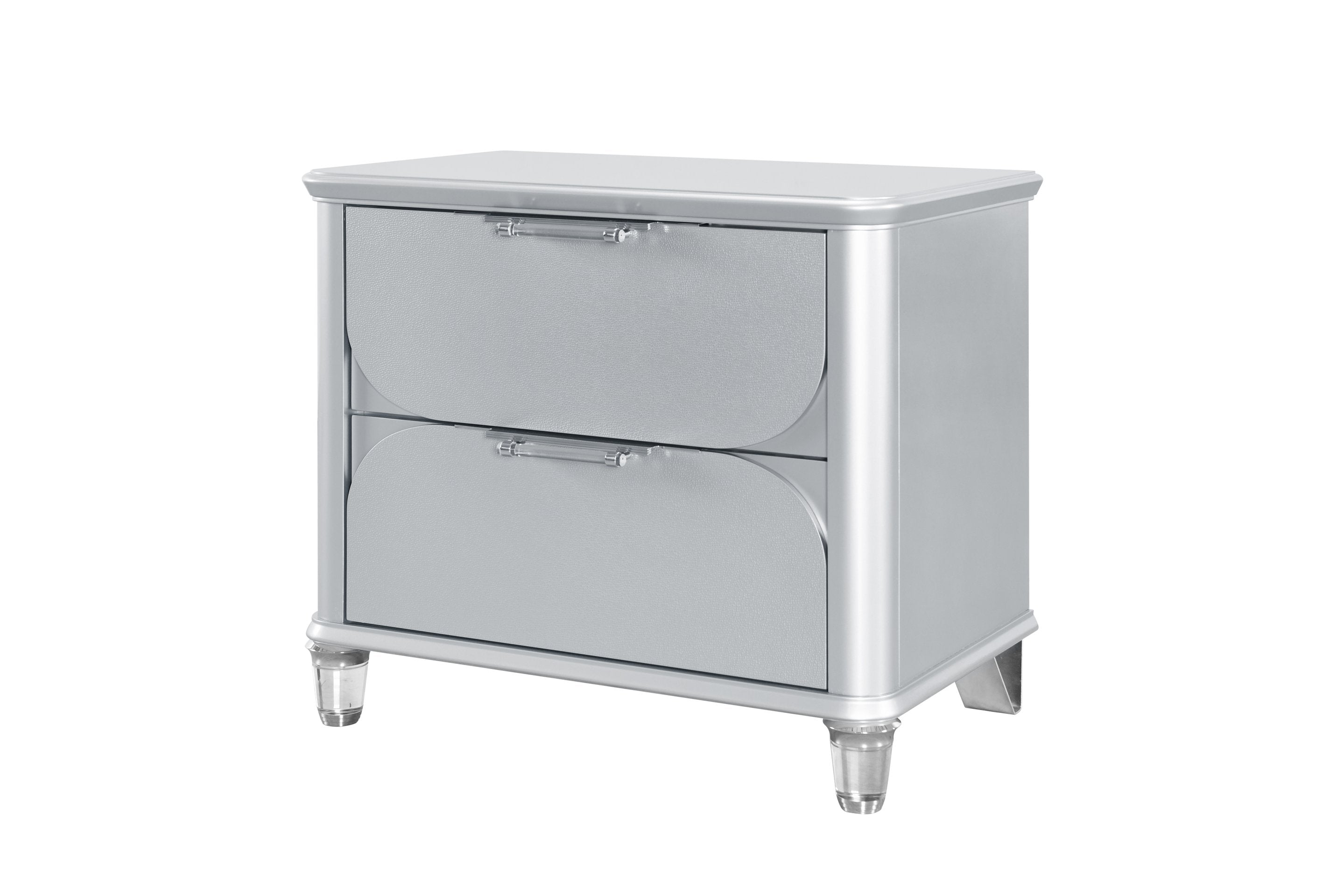 Elevate your bedroom with a modern bedside piece that blends refined metallic finishes and thoughtful storage. This silver nightstand pairs a sleek silhouette with textured detailing and acrylic legs for a light, contemporary look — ideal for urban, transitional, or glam interiors.