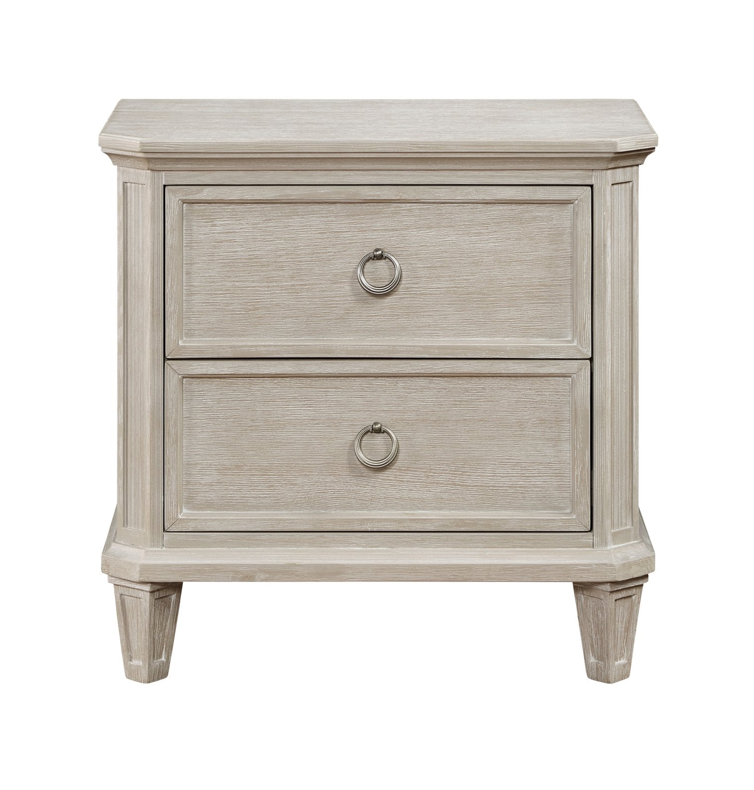 Bring timeless elegance to your bedroom with this Leander Collection nightstand, which blends traditional details with a modern silhouette. Clipped corners and picture-frame drawer fronts create visual interest, while a light brown oak veneer and weathered nickel ring pulls offer a warm, refined finish. Designed for everyday use, this bedside cabinet provides practical storage without sacrificing style.