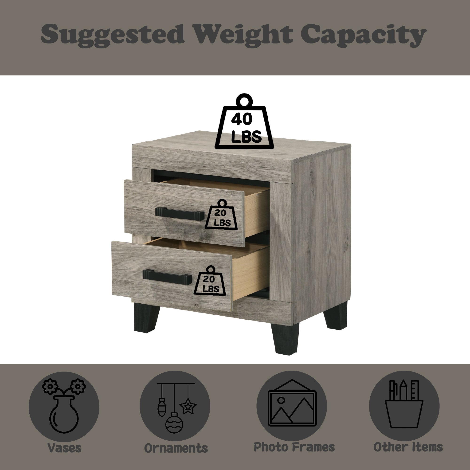 - Weight Limit (Drawer): 20lbs, (Top): 40lbs