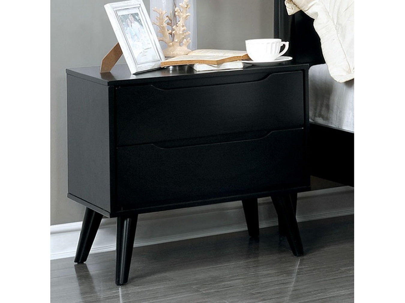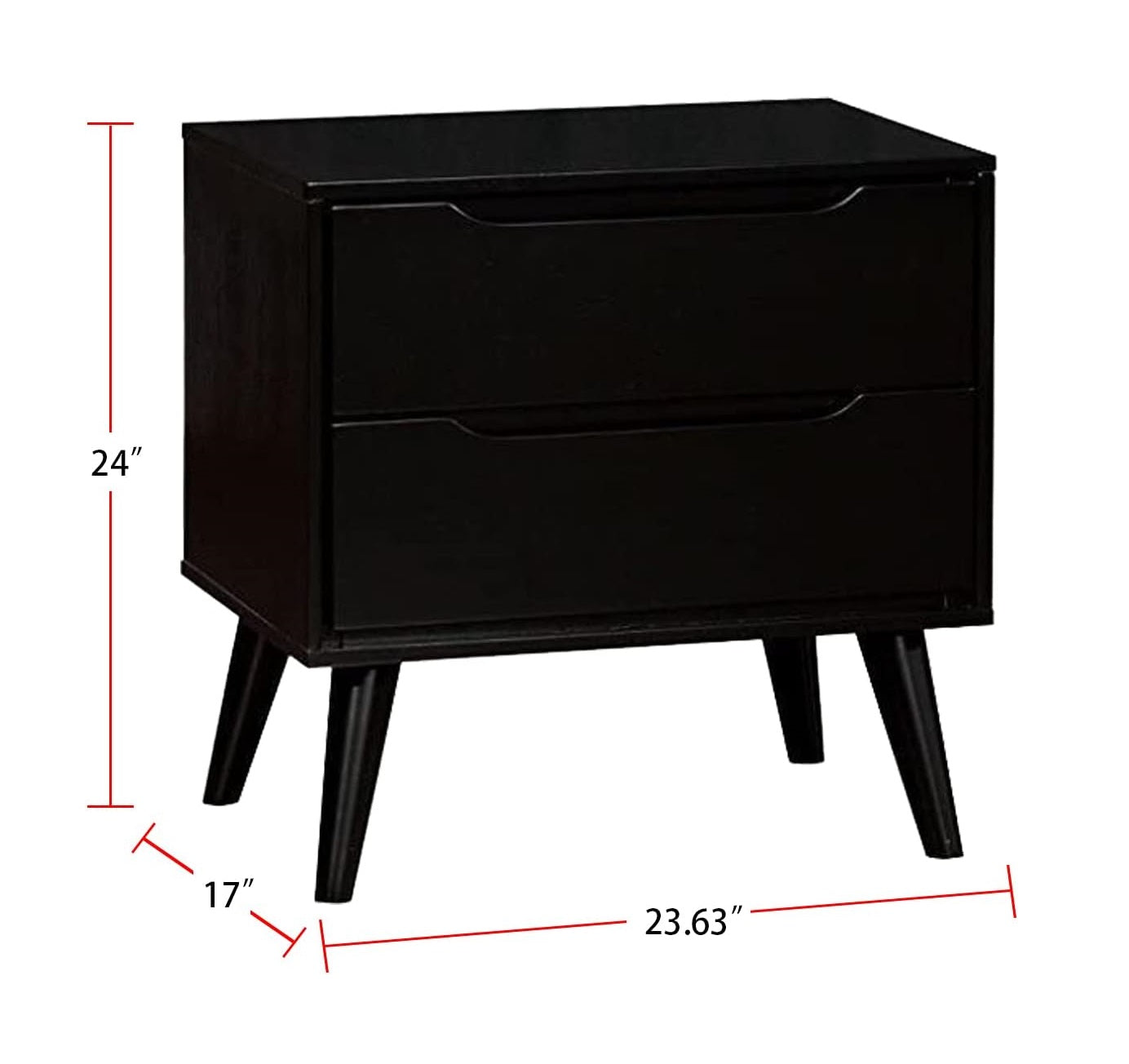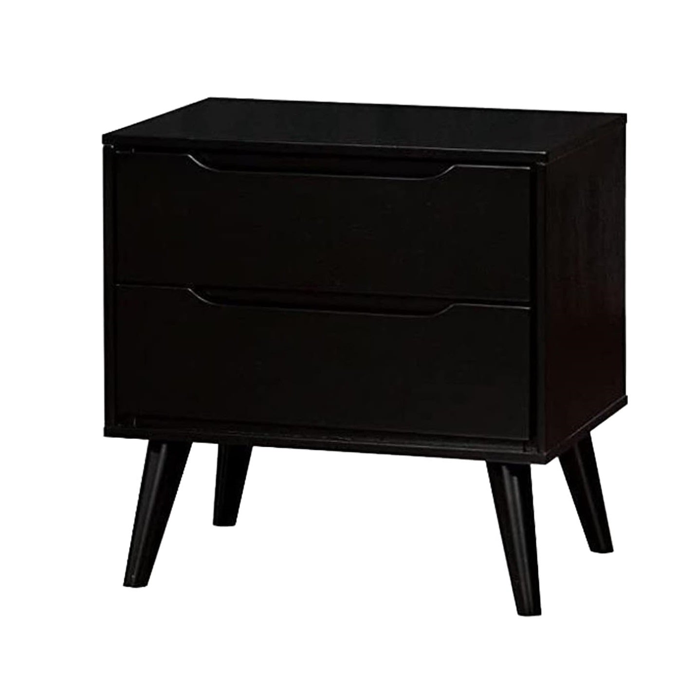 Give your bedroom an instant style upgrade with this Mid-Century Modern nightstand. Clean lines, tapered round legs, and recessed drawer pulls combine for a sleek, functional bedside piece that complements contemporary and retro-inspired interiors. Built with solid wood and wood veneer accents, it offers durable construction and two smooth-gliding drawers for everyday storage.