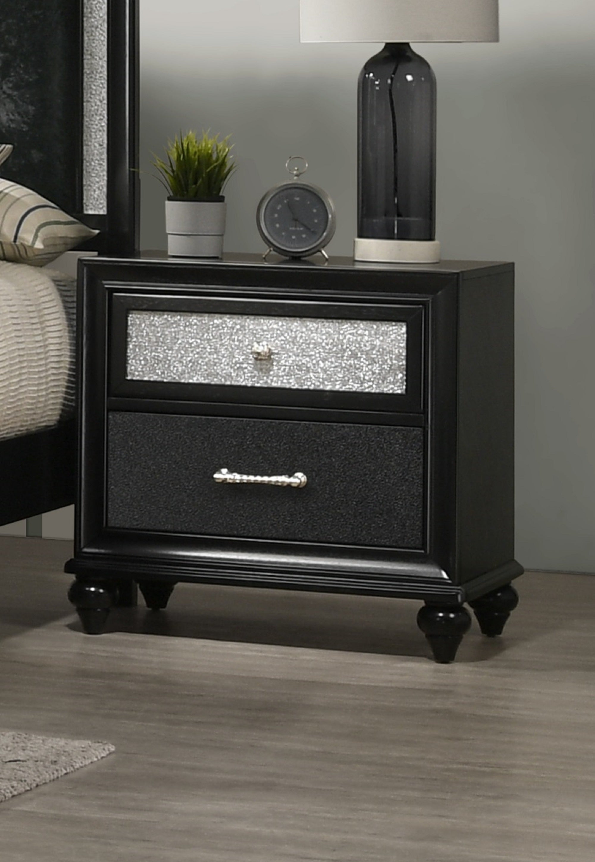 Elevate your bedroom with this modern black-and-silver finish nightstand that blends contemporary style with practical storage. Sleek lines and a contrasting metal-like finish create a refined focal point, while roomy storage and easy assembly make it a functional choice for nightly essentials.