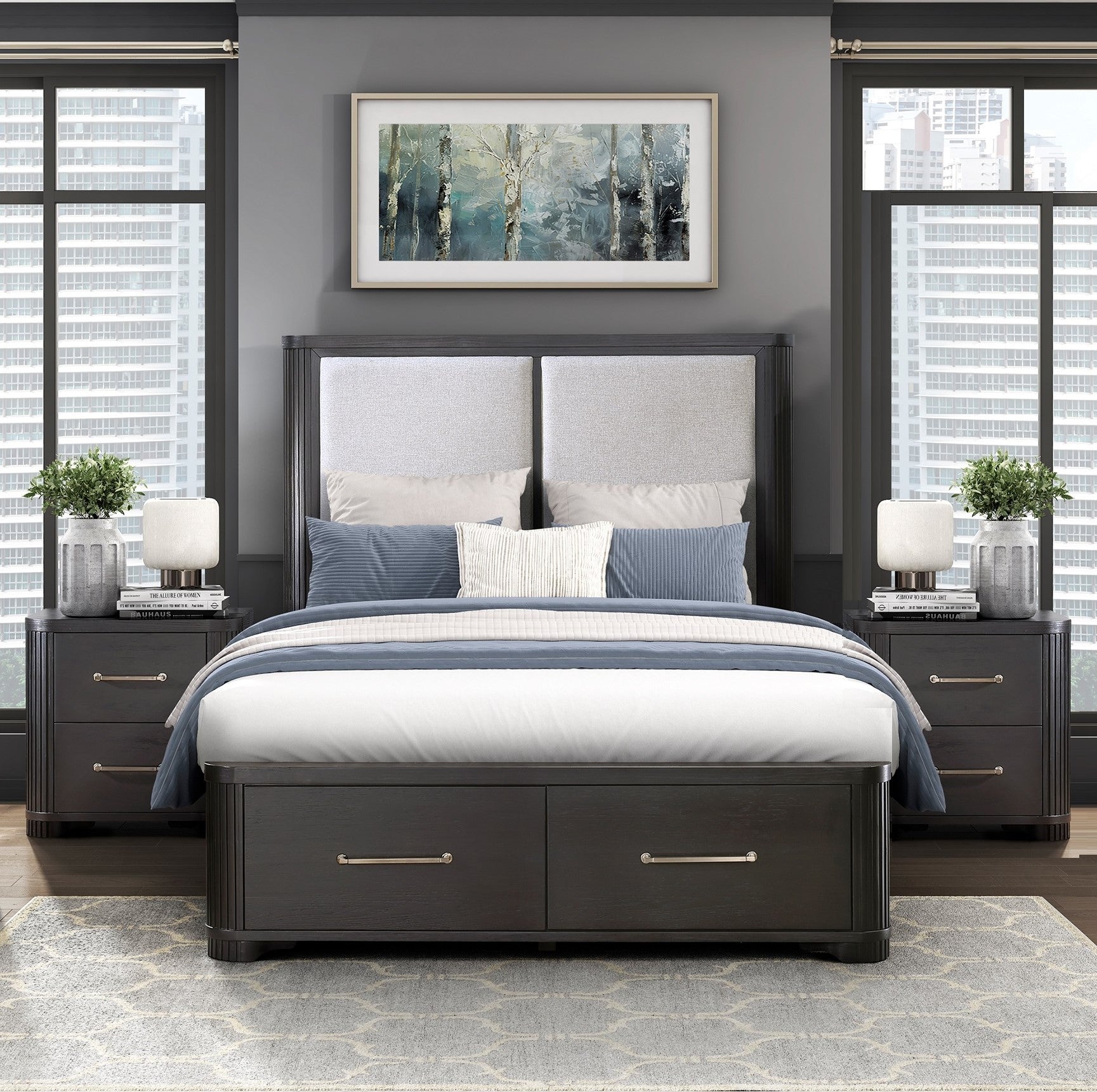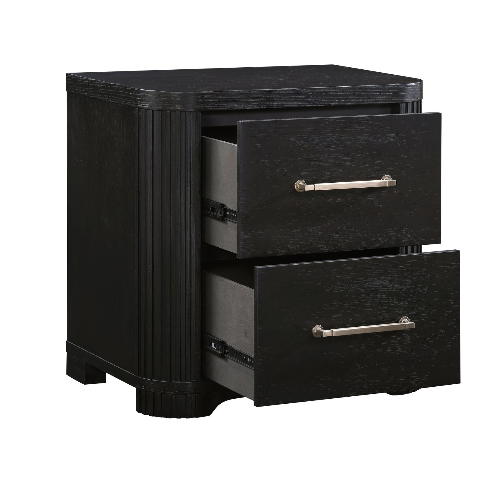 Bring modern elegance and Art Deco-inspired flair to your bedroom with this charcoal-finish nightstand from the Gilbert Collection. Crafted with oak veneer that highlights distinct wood grain and finished with polished brass-tone bar pulls, this bedside table offers both sophisticated style and practical storage with two smooth-gliding dovetail drawers.