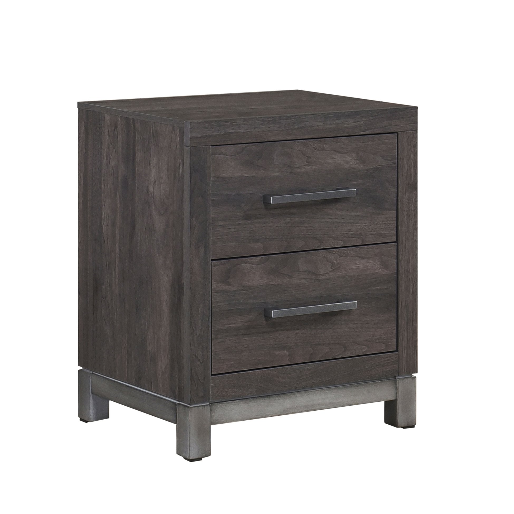 Bring modern sophistication to your bedroom with this Zephyr Collection nightstand, where clean lines and contrasting finishes create a refined focal point. The dark gray faux-wood melamine veneer pairs with painted metal-finish banding and antique silver bar hardware for a contemporary look that blends form and function. Compact yet practical, this nightstand offers two smooth-gliding drawers to keep bedside essentials neatly organized.
