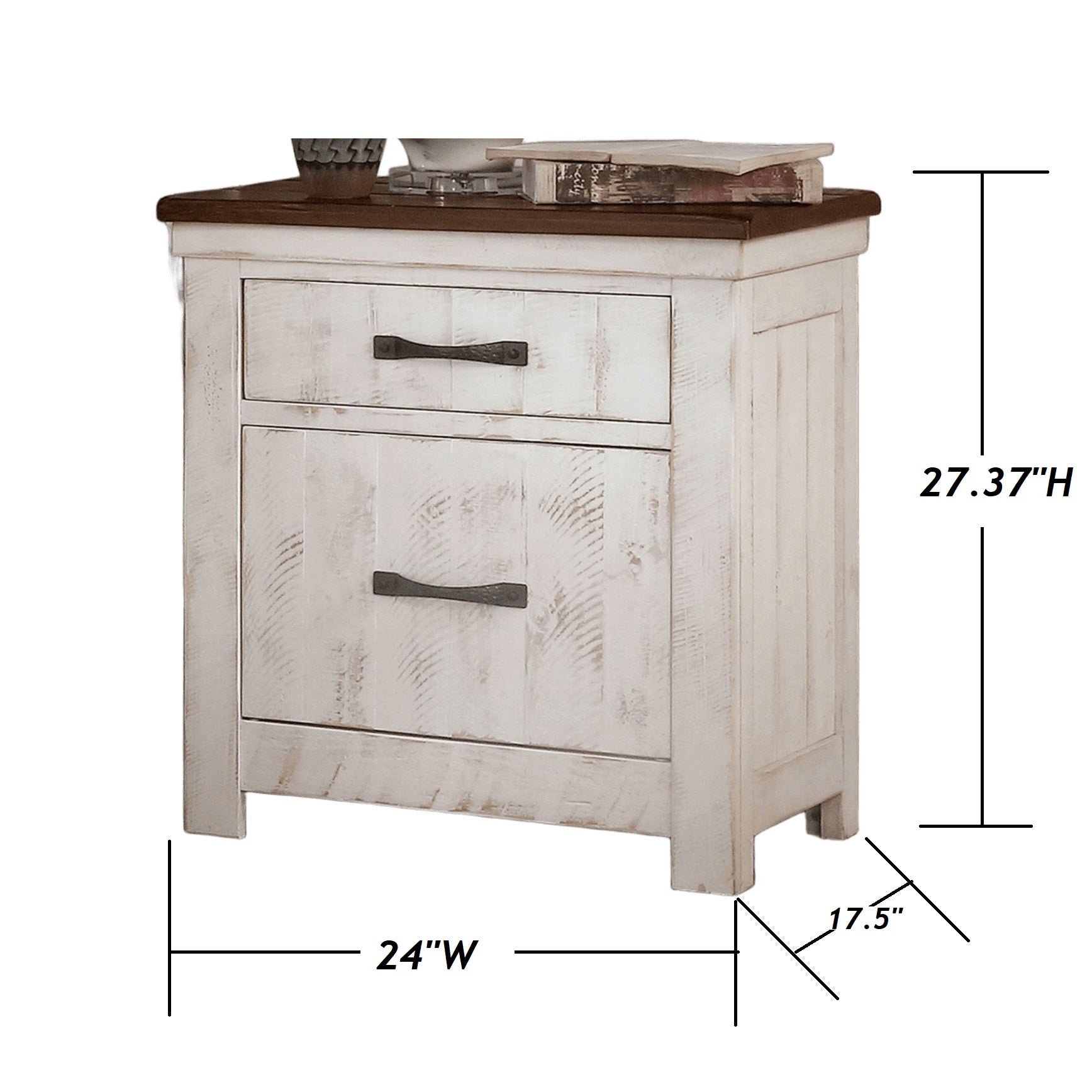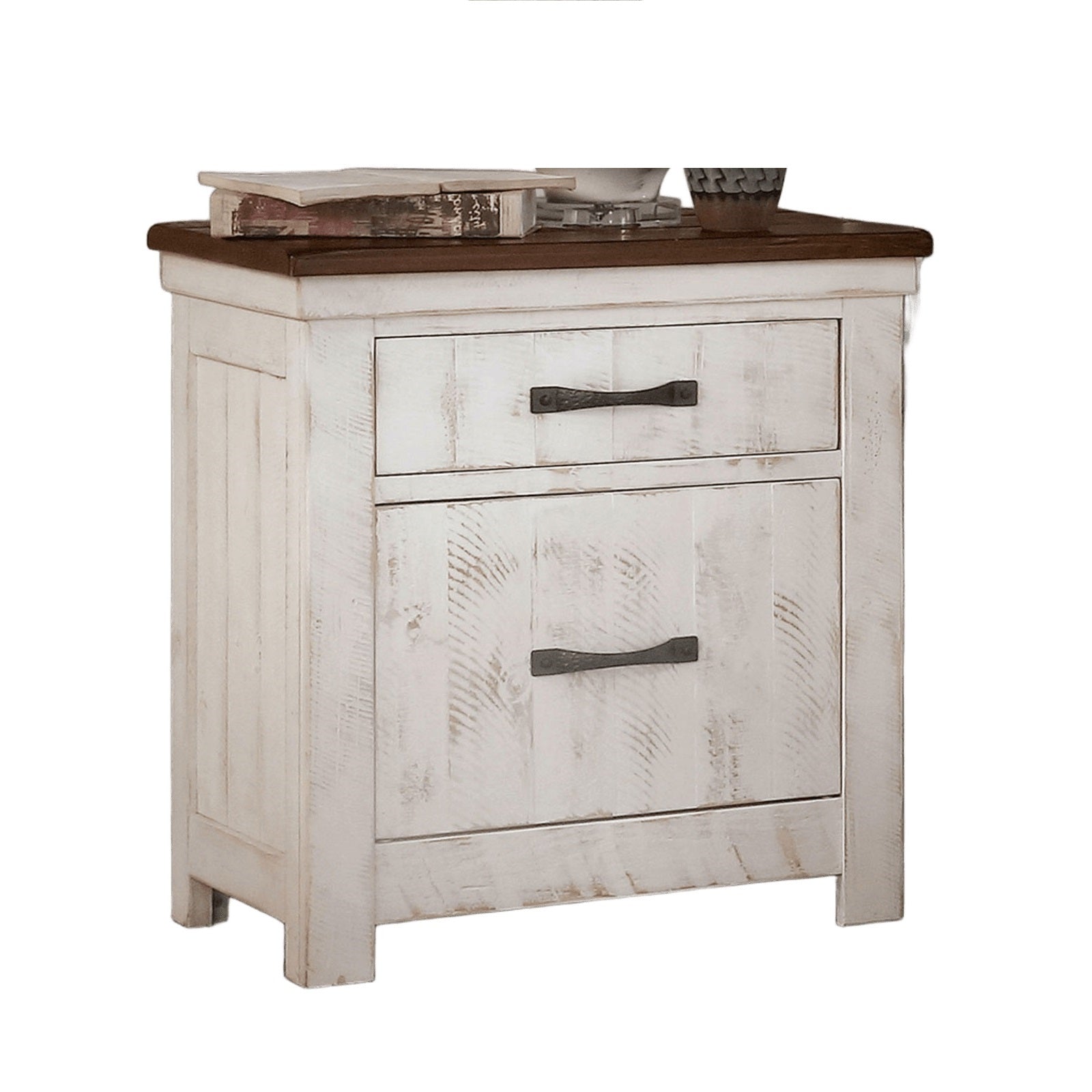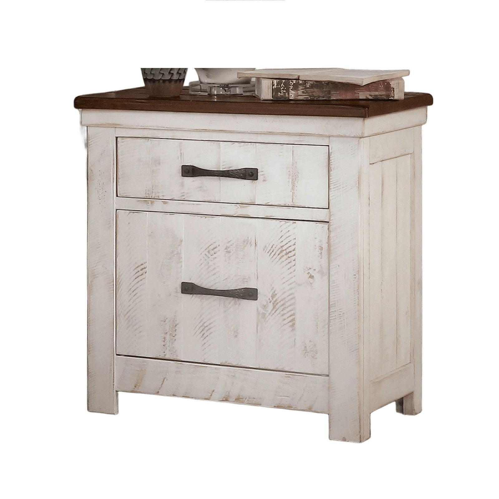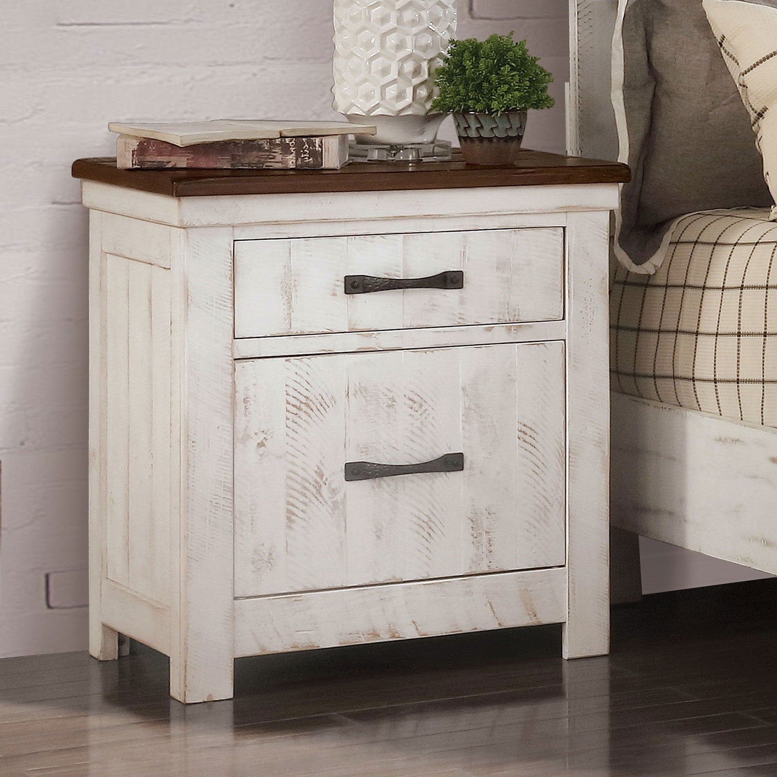 Bring classic character and practical function to your bedroom with this transitional distressed-white nightstand. Its antique-inspired finish, solid wood construction, and thoughtful details—like brass arch pulls and felt-lined drawers—deliver both style and everyday usefulness. Ideal beside any bed, the piece pairs well with traditional and rustic decor while offering durable storage for nighttime essentials.