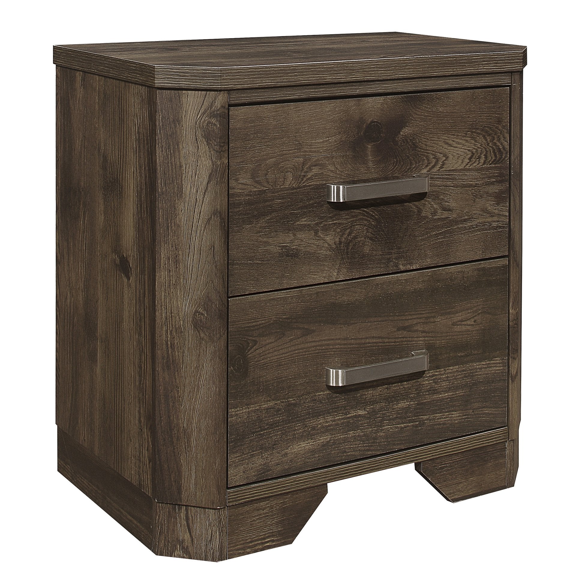Bring warm, rustic charm and practical storage to your bedroom with this transitional-style nightstand. Its faux-wood grain finish, clipped-corner frame, and nickel-finished metal drawer pulls create a balanced look that complements both modern and traditional decor. Thoughtfully sized drawers provide concealed storage for nighttime essentials while the top surface offers a convenient spot for a lamp, book, or alarm clock.