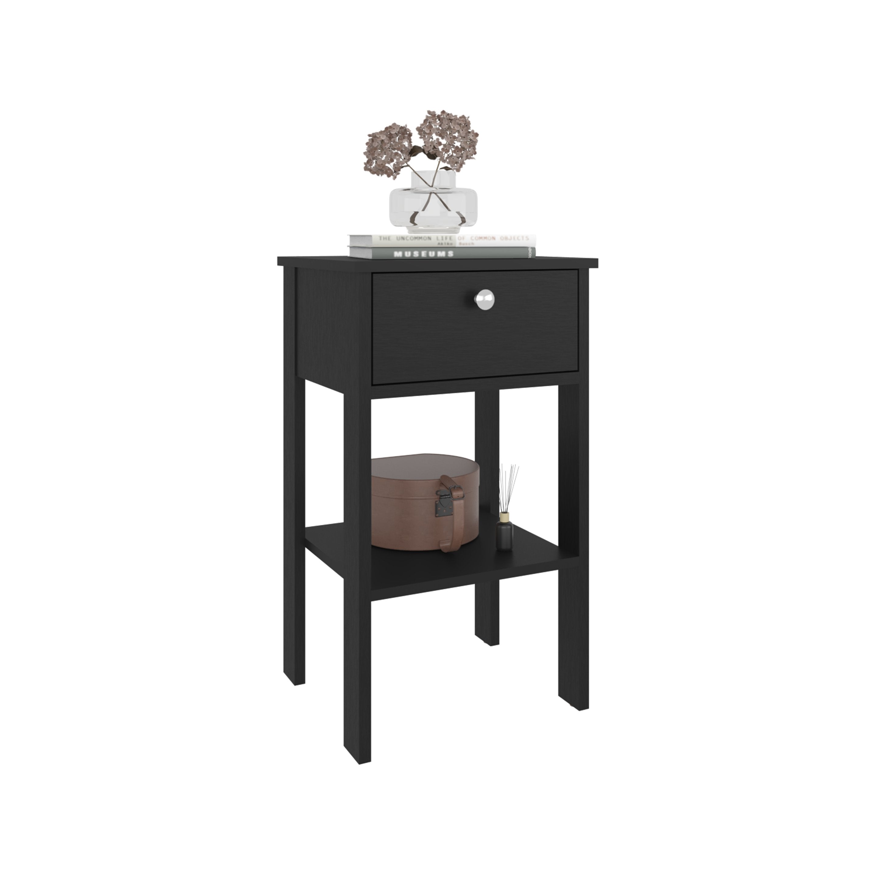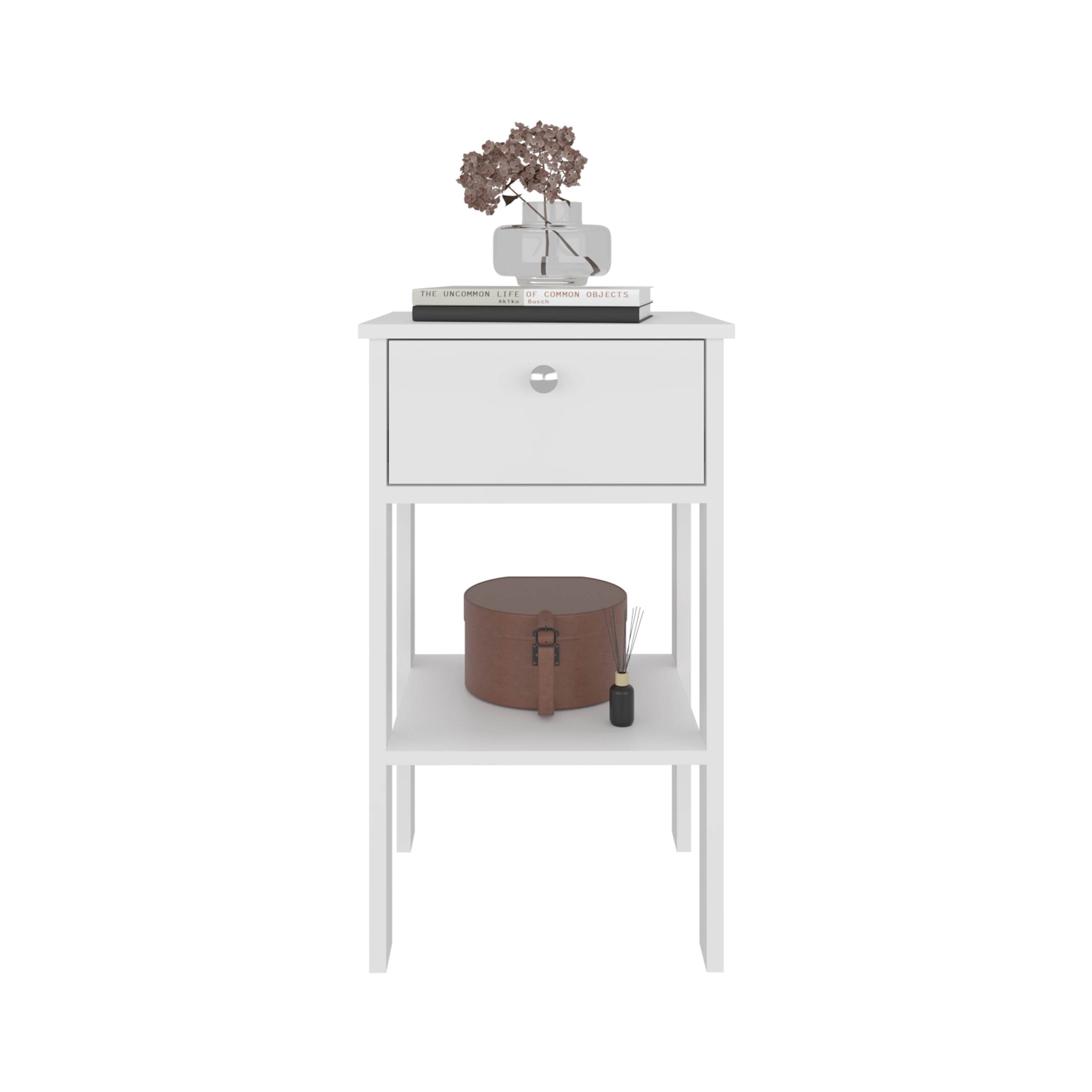 - One smooth-glide drawer with a round metallic knob for discreet storage
