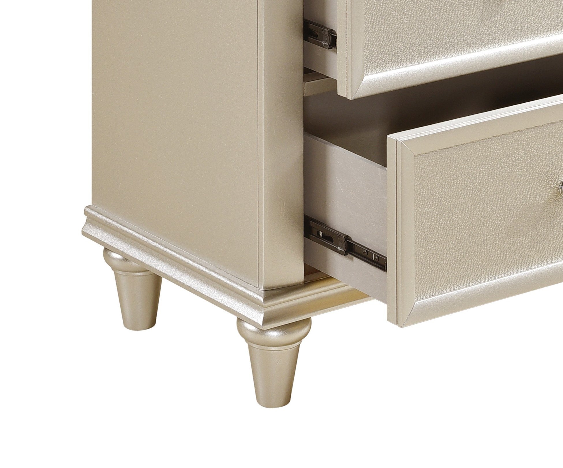 Elevate your bedroom with a refined blend of traditional form and modern polish. This silver-finish nightstand features textured drawer fronts and high-polished knobs that catch the light for understated glamour. Thoughtfully sized and designed for everyday use, it offers practical storage and a cohesive look that complements both classic and contemporary interiors.
