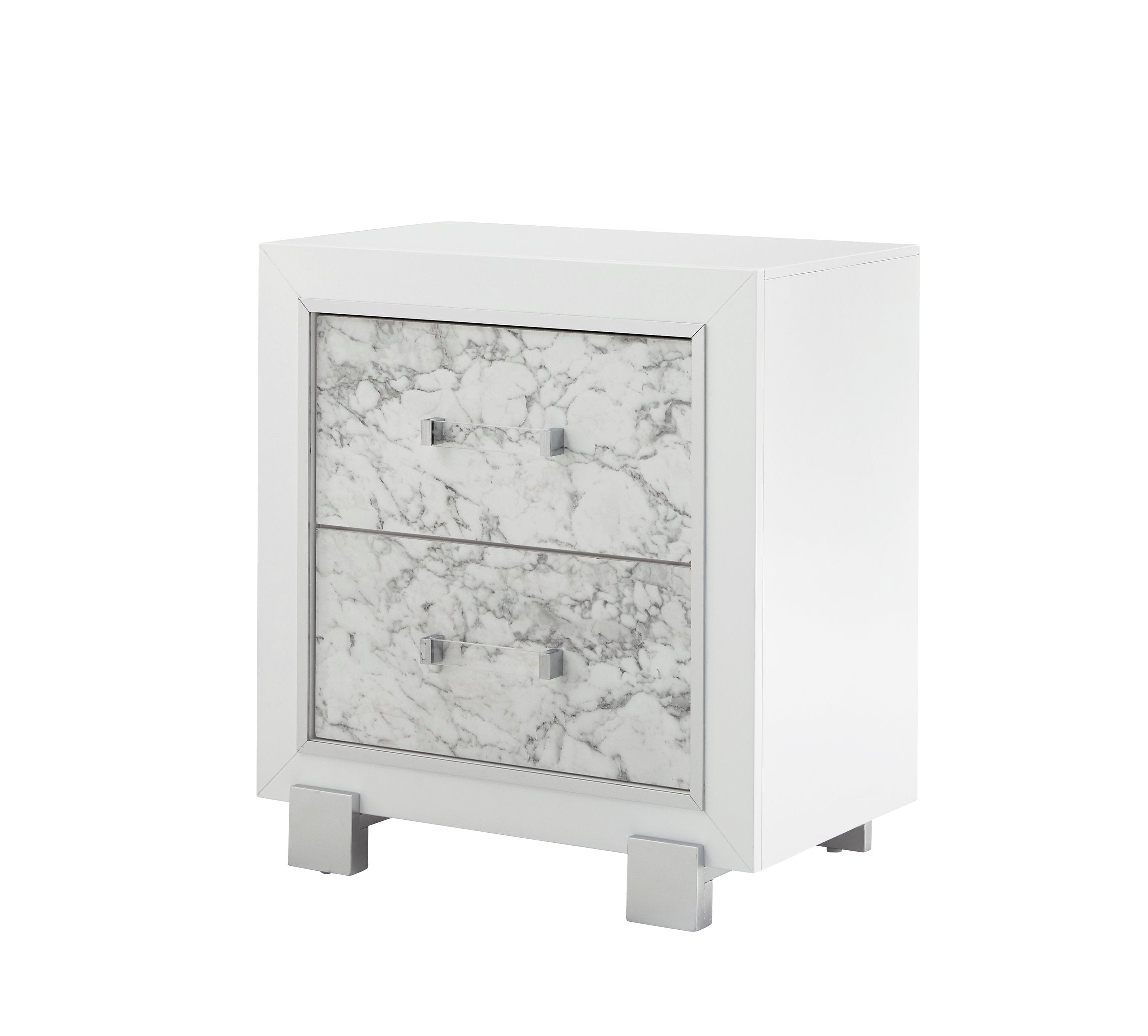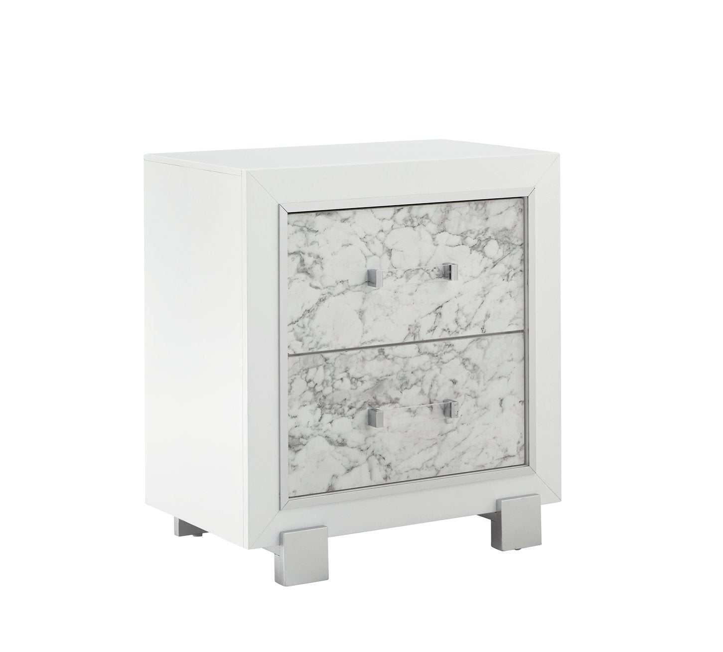 Bring elegant, contemporary style to your bedroom with this marble-accented white nightstand. Clean lines, a sturdy rubberwood frame, and marble-style drawer fronts create a refined focal point while offering practical storage for bedtime essentials. Ideal for modern, transitional, or coastal-inspired interiors.