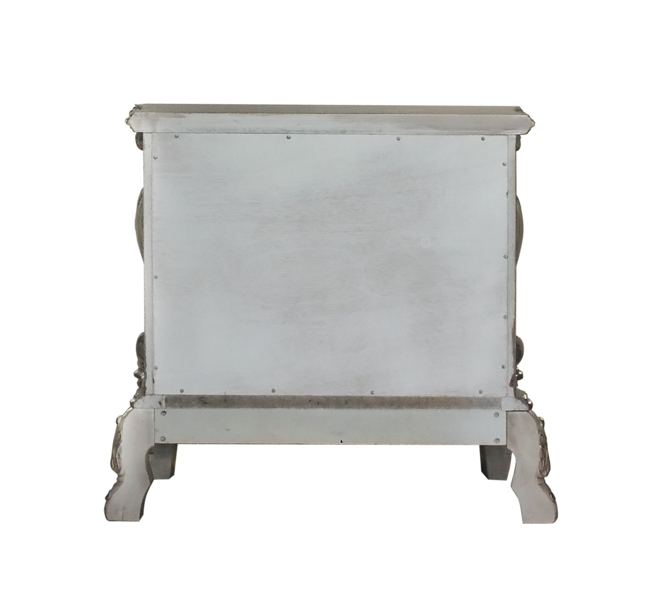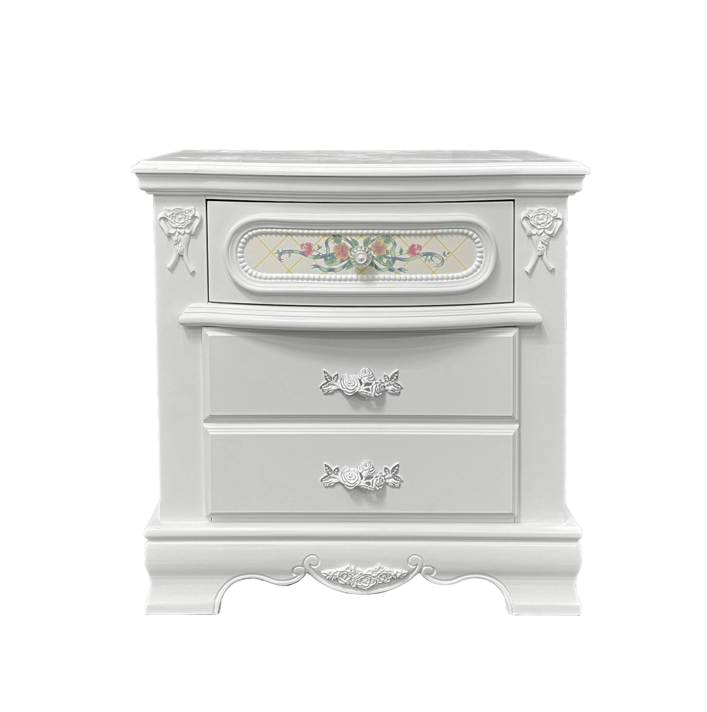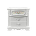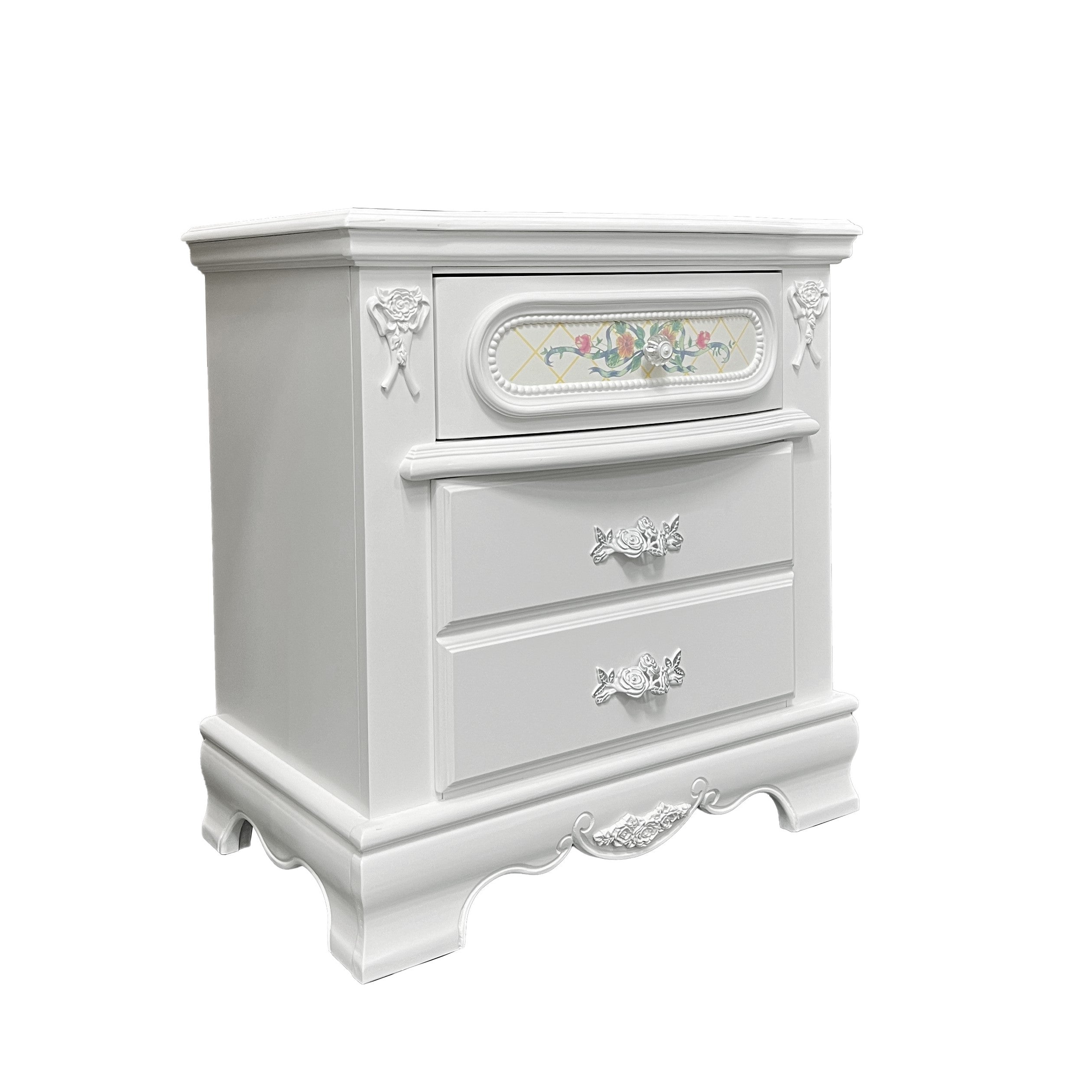 Add a touch of classic charm and feminine whimsy to a bedroom with this elegant two-drawer nightstand. Designed with floral decals, rope moldings, and a profiled crown, it pairs decorative appeal with everyday function — ideal for a princess-themed or traditionally styled room. Simple assembly required; sold as one nightstand.