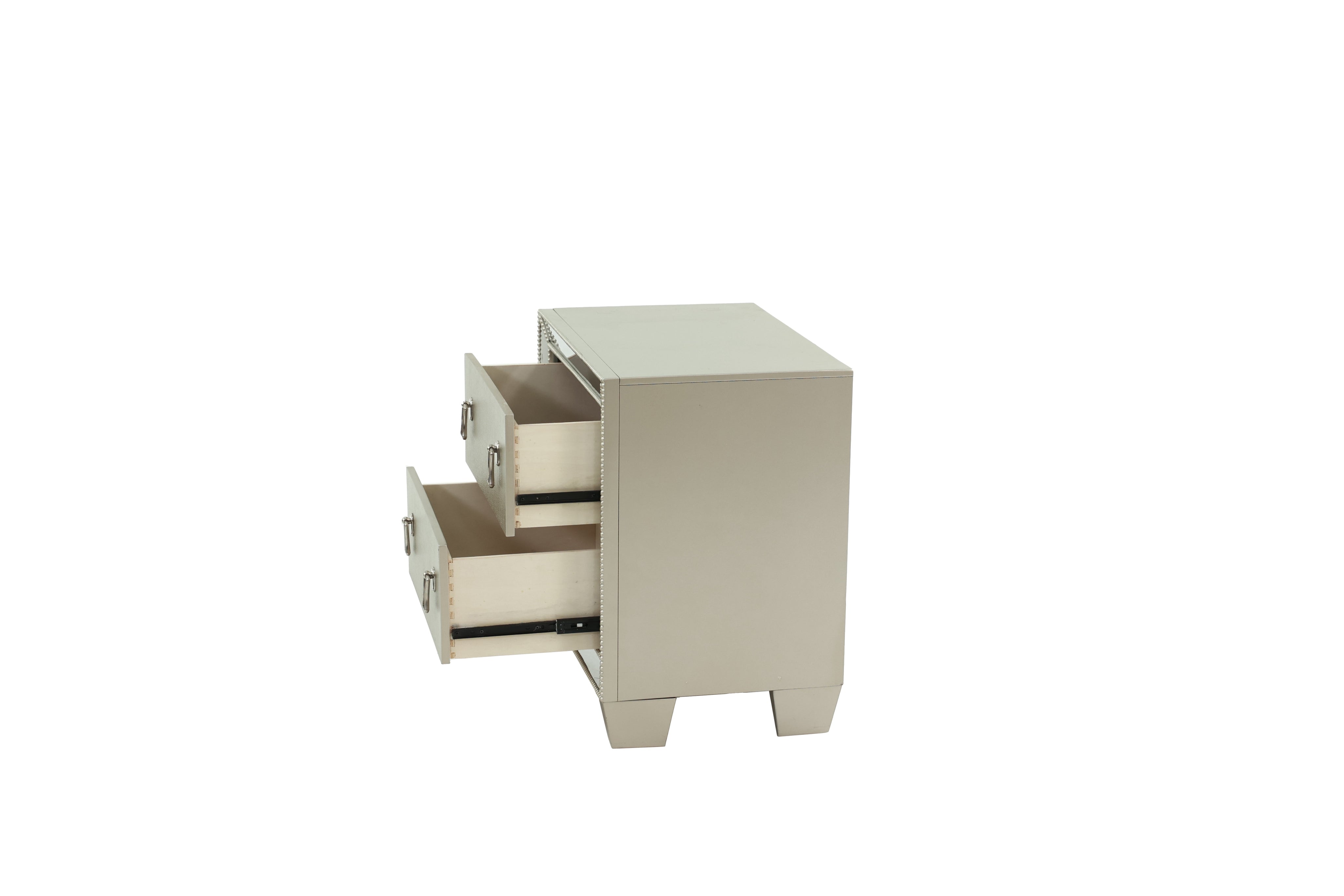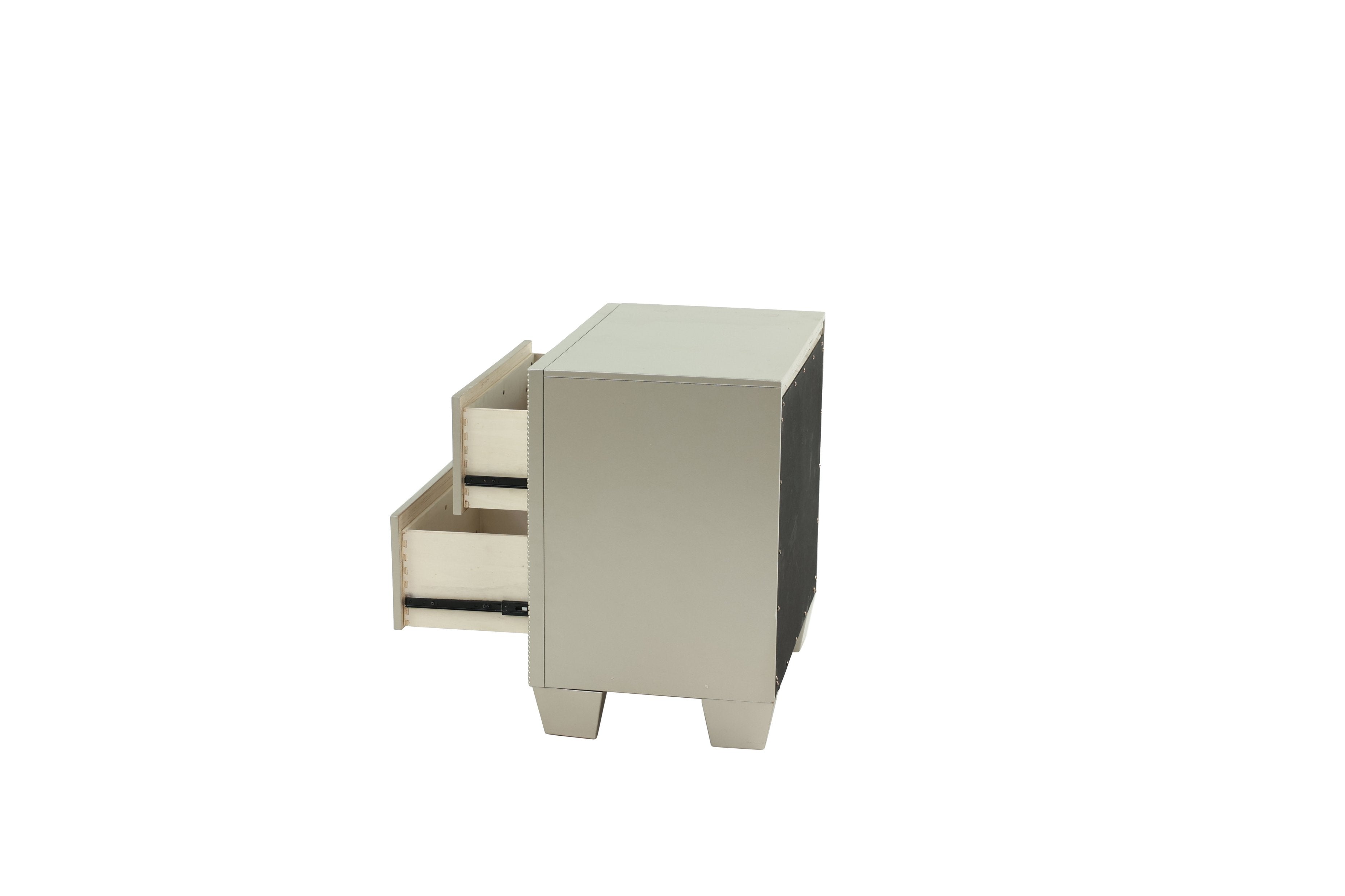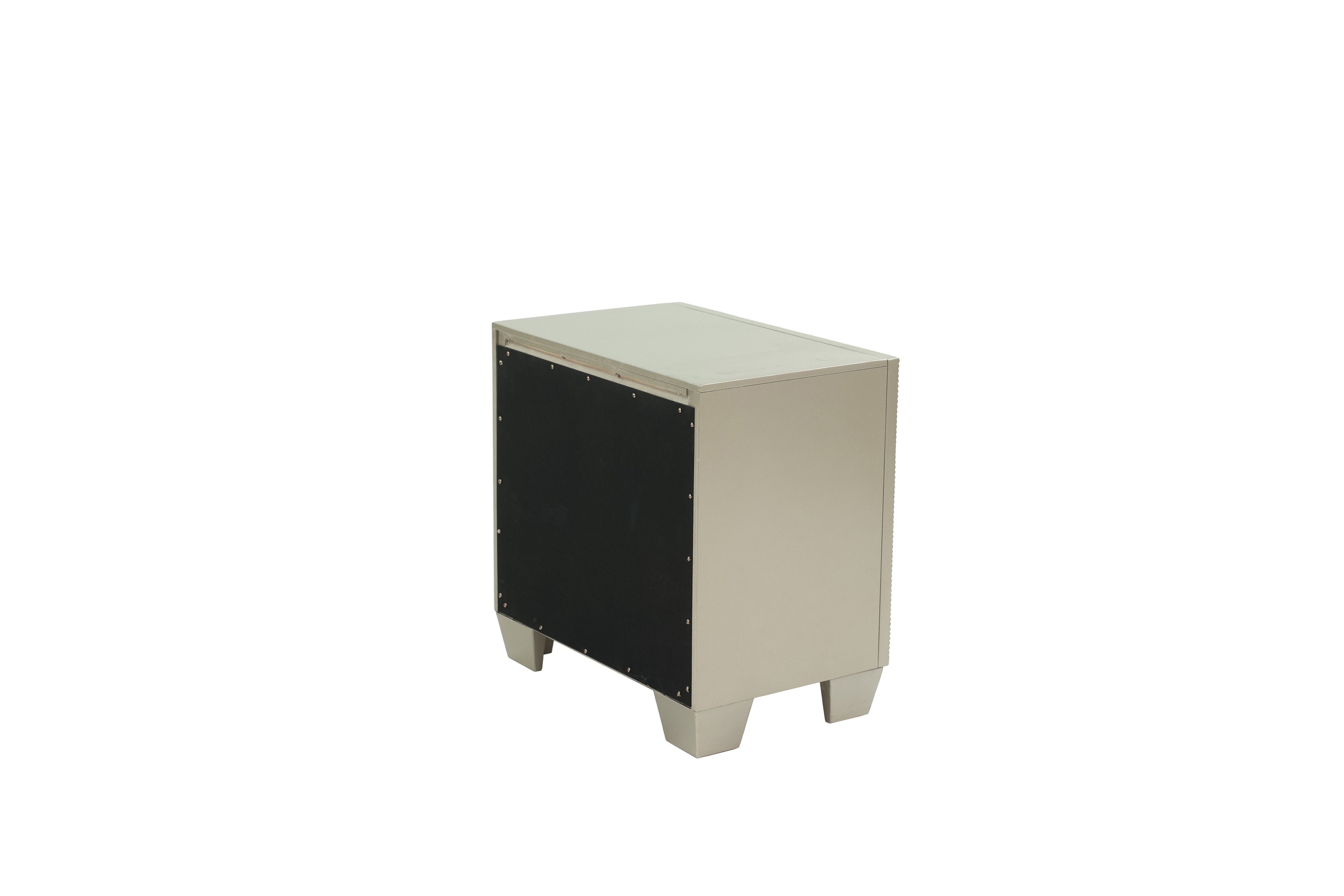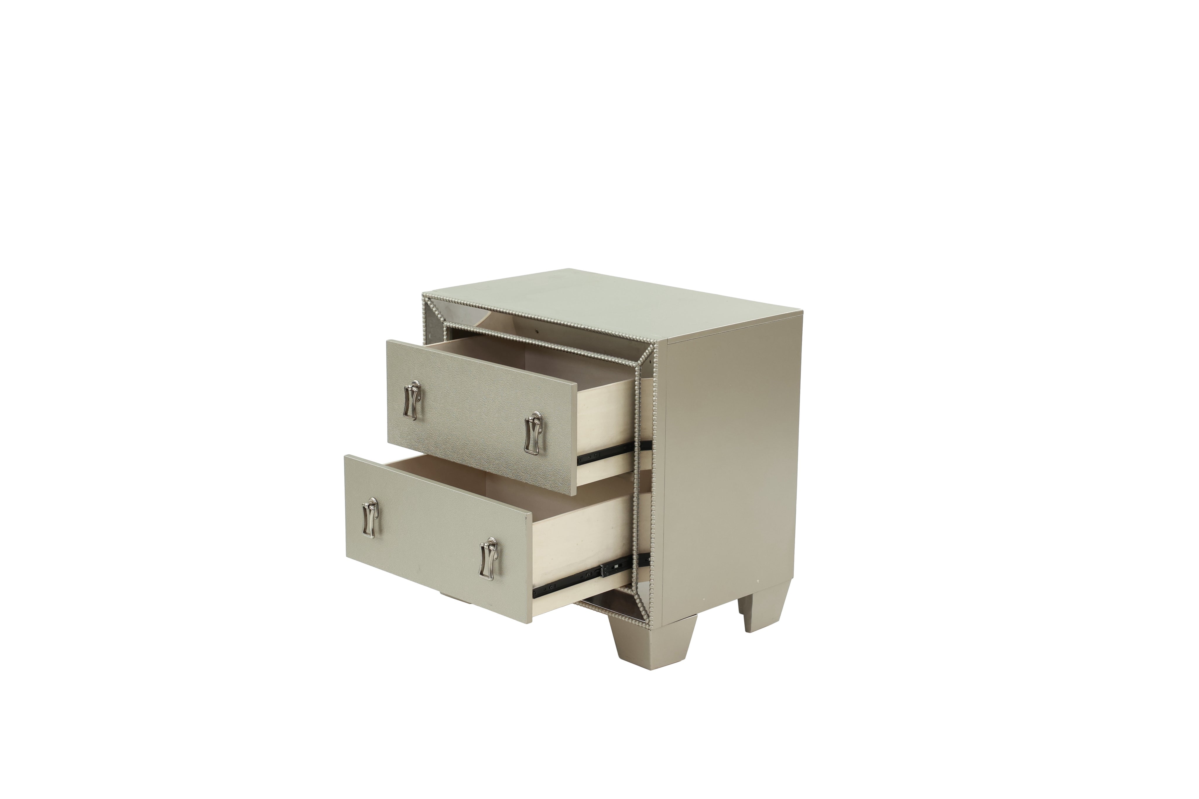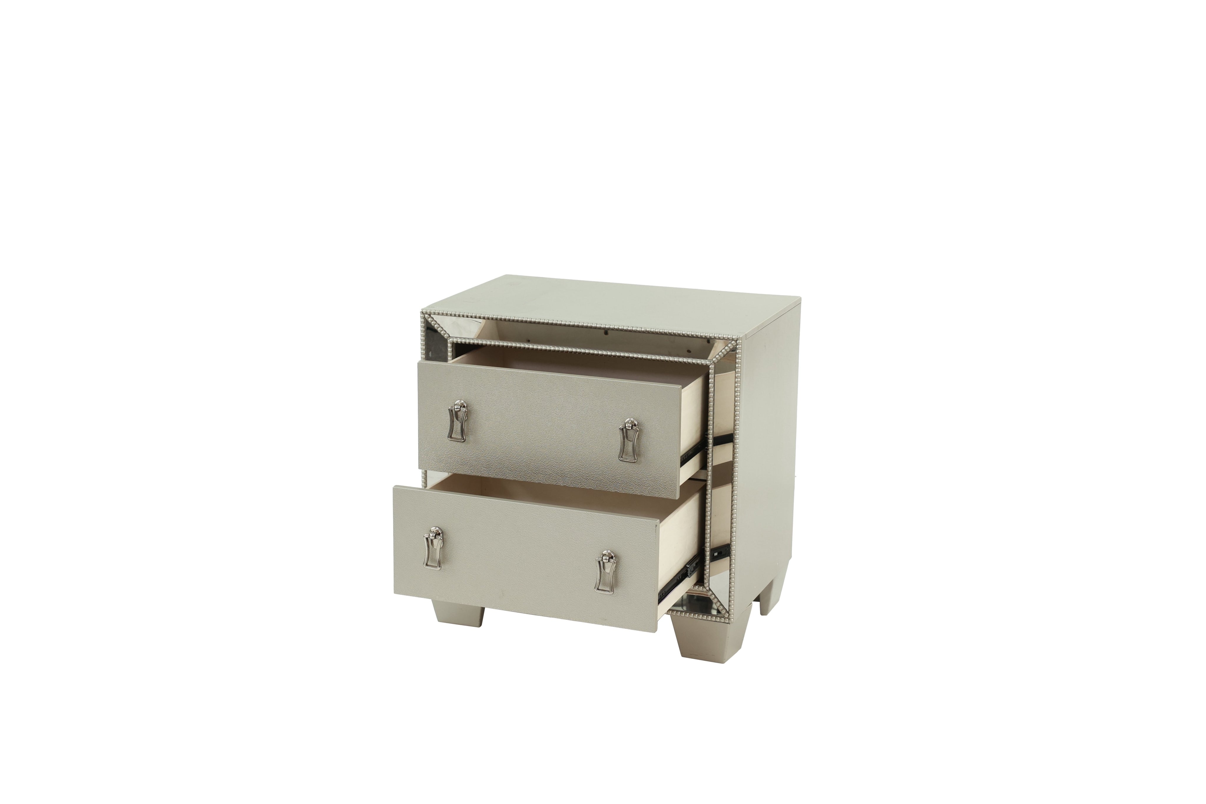 Bring a touch of timeless elegance to your bedroom with this traditional-style nightstand finished in refined silver. Its antique-inspired details and mirrored accents create a sophisticated focal point while the two spacious drawers provide practical bedside storage. Crafted from a blend of pine, particle board, poplar veneer and plywood with stainless decorative elements, this piece balances classic design with everyday durability.