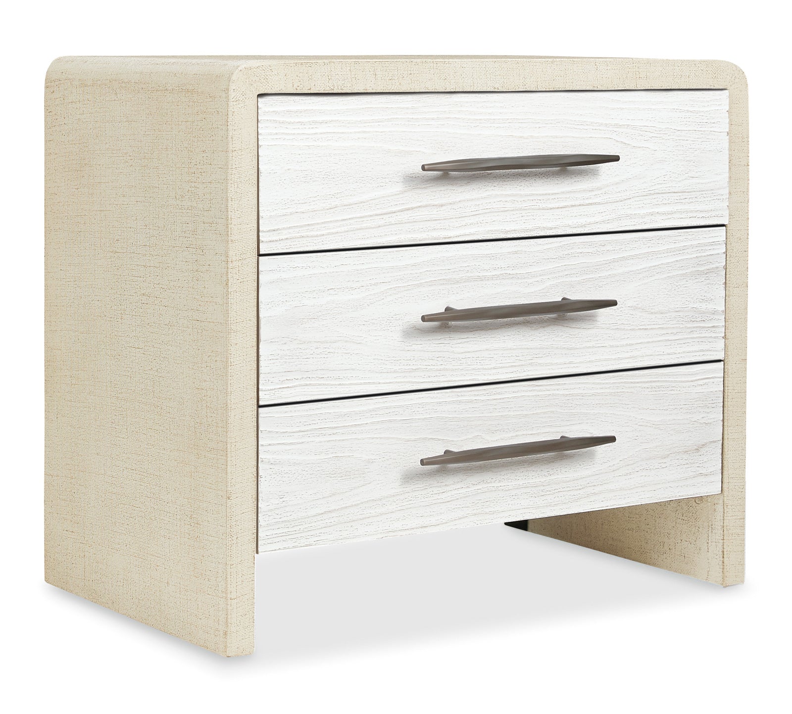 - Color: 6120-90116-05 Cascade Three-Drawer Nightstand - Whites/Creams/Beiges with Outside of case: Pebble Beach: lacquered burlap finish. Drawer fronts: Chalk: cast resin in a soft, white finish. Champagne colored bar pull hardware.