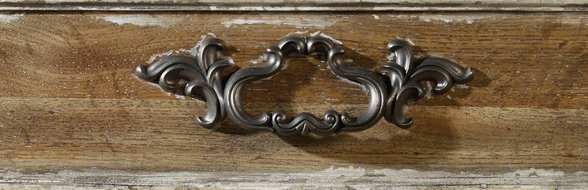 - Antique-inspired Hardware: Custom-designed, generously sized burnished bronze drawer pulls add to the timeless appeal.