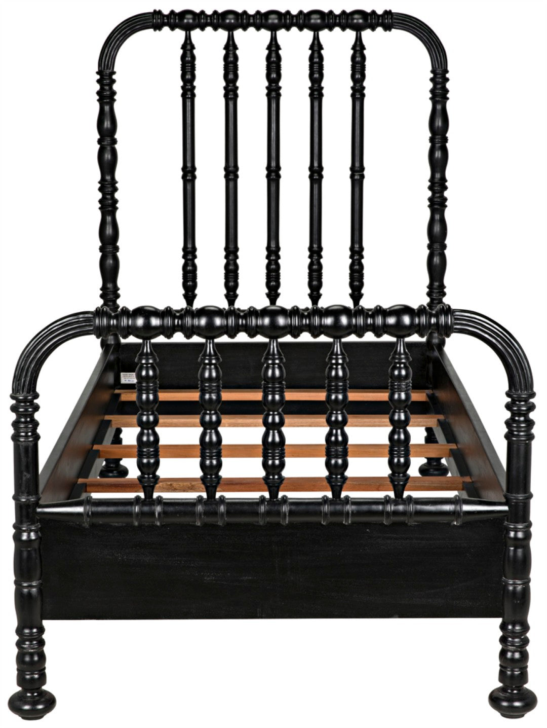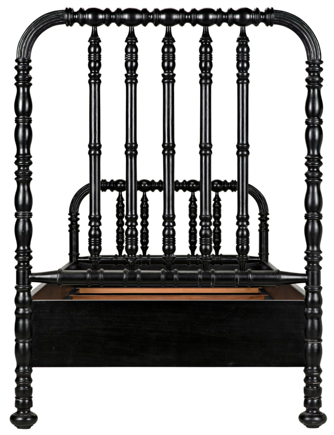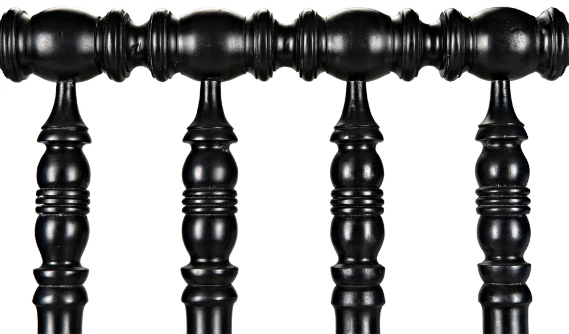 This elegant twin bed combines classic spindle craftsmanship with a refined, contemporary finish—bringing timeless character and artisanal detail to a compact bedroom. Hand-carved from solid mahogany and finished in a hand-rubbed black, it offers durability and visual warmth while the spool (bubble) design adds a sculptural focal point that complements both traditional and modern decor.