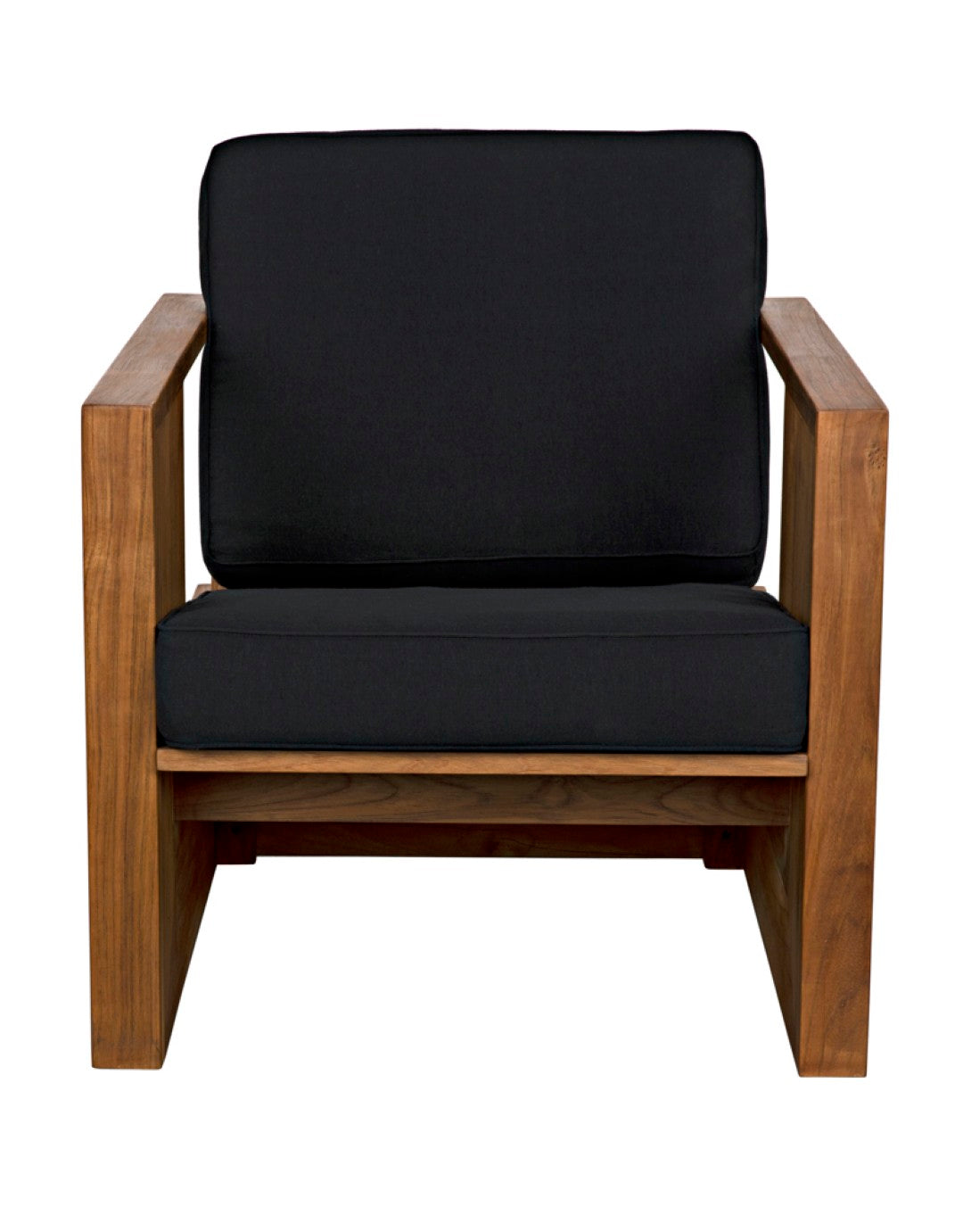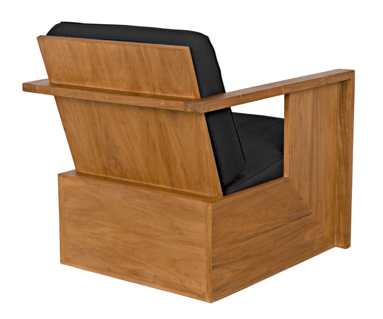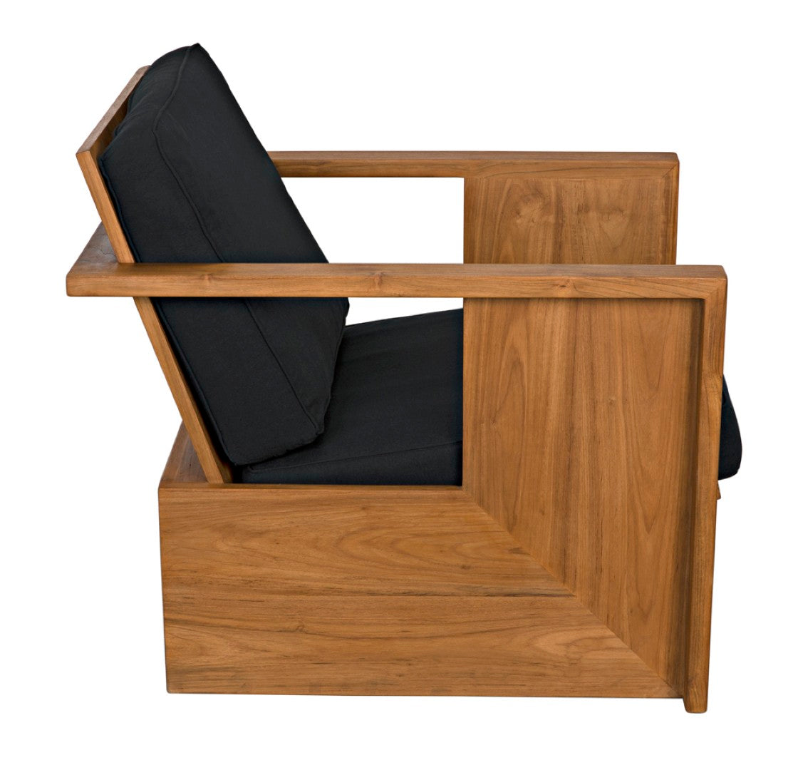 Bring natural warmth and sculptural presence to your space with this handcrafted teak chair. Hand-hewn slices of solid teak showcase rich grain and organic form, while thick black cotton cushions add plush comfort and visual contrast. Finished in a clear satin coat to protect the wood and highlight its natural beauty, this chair works equally well as a statement piece in a living room or as an accent in a study.