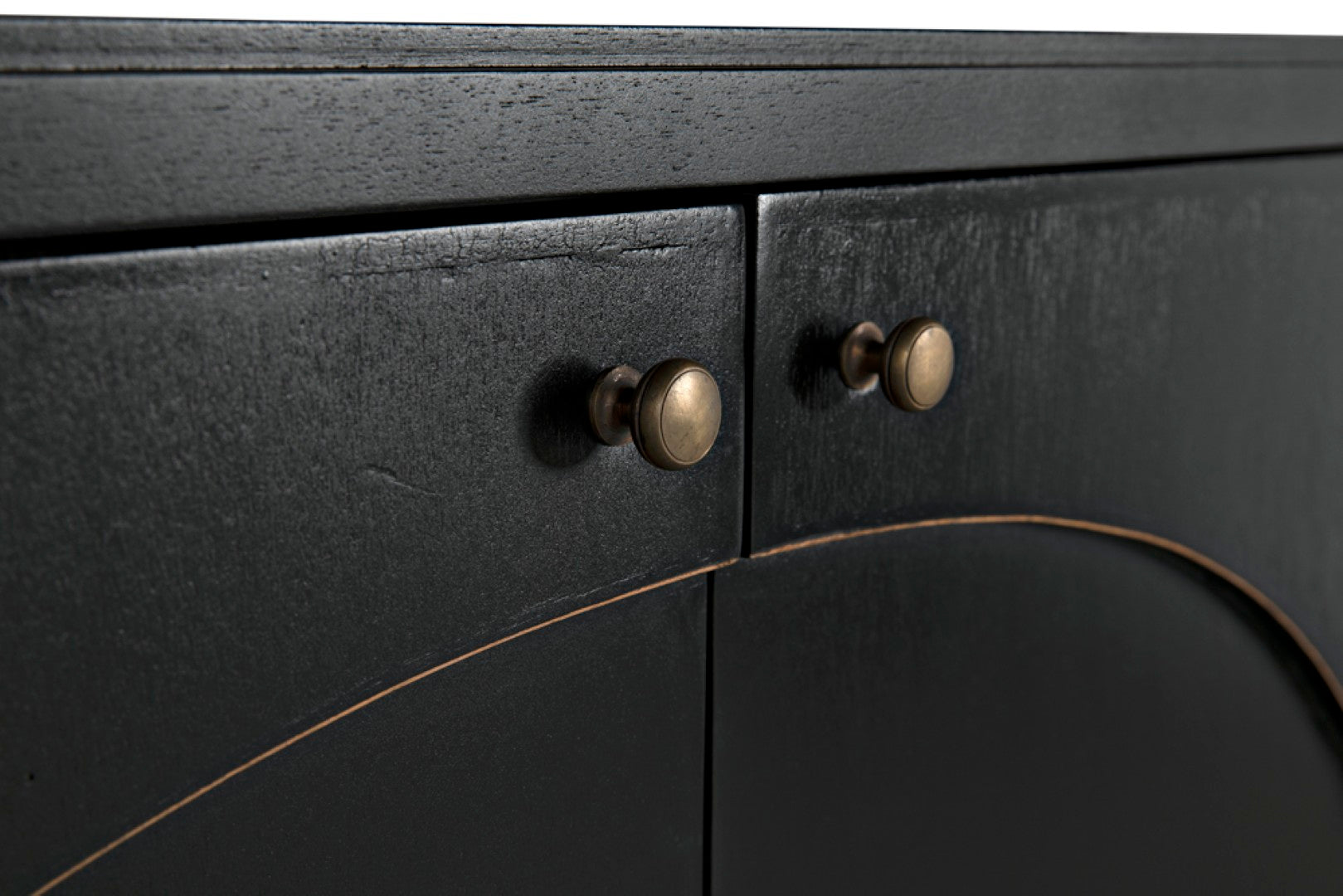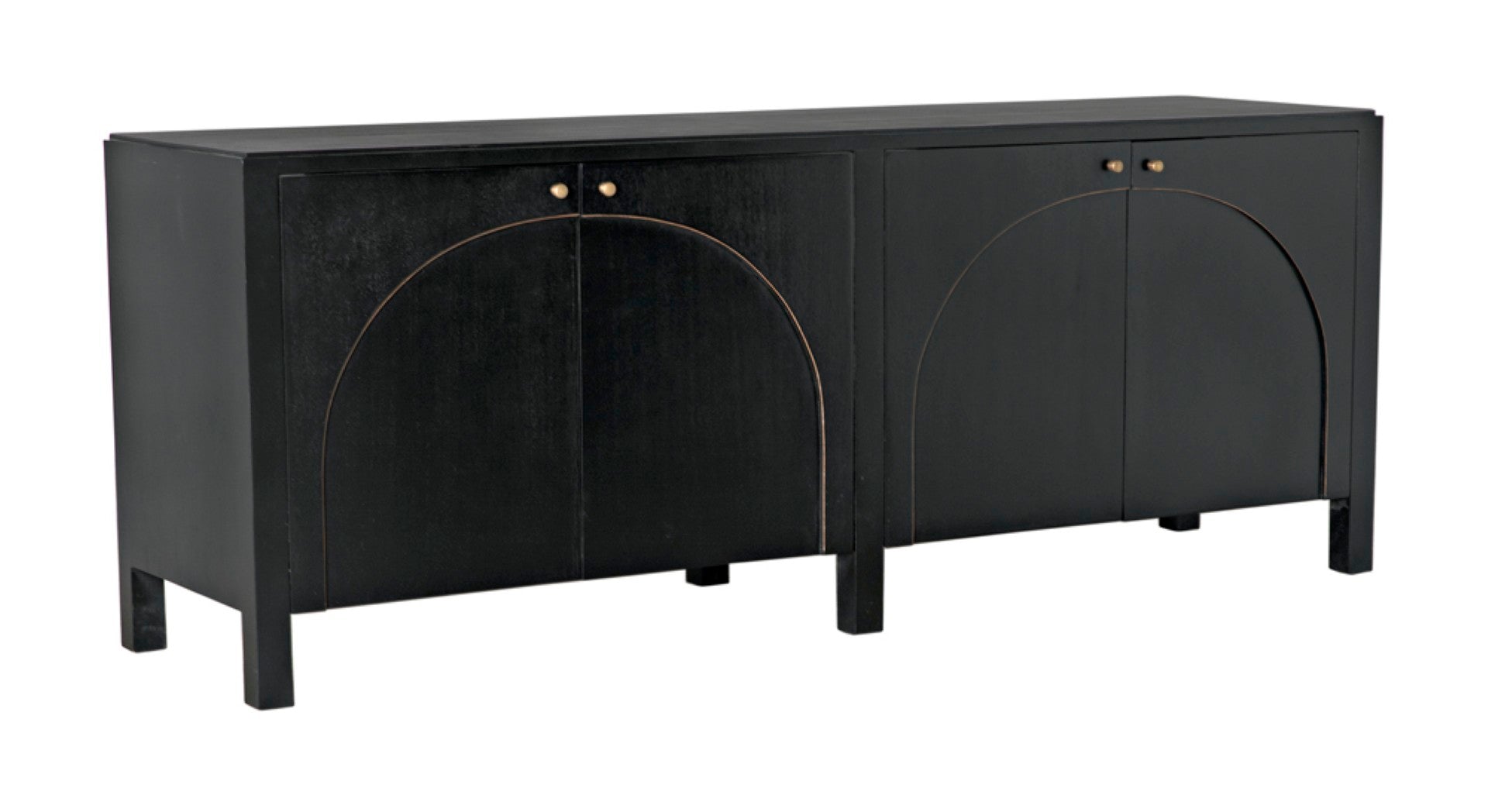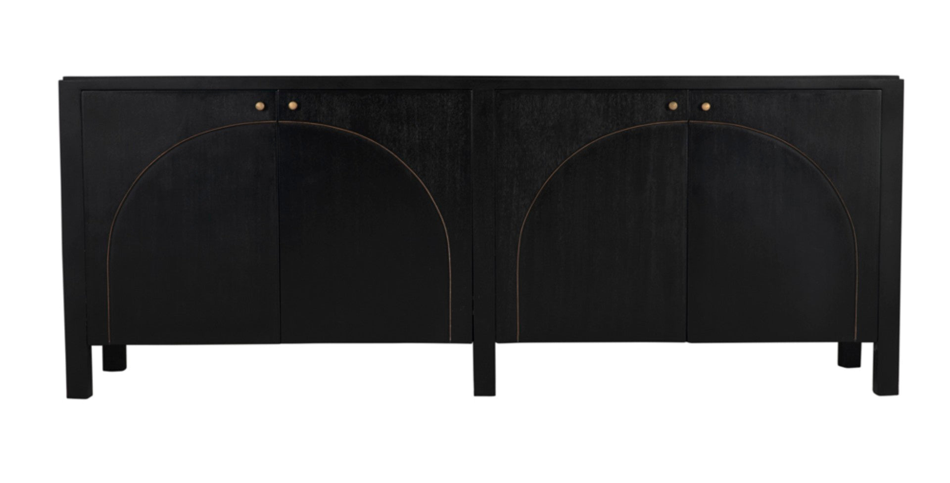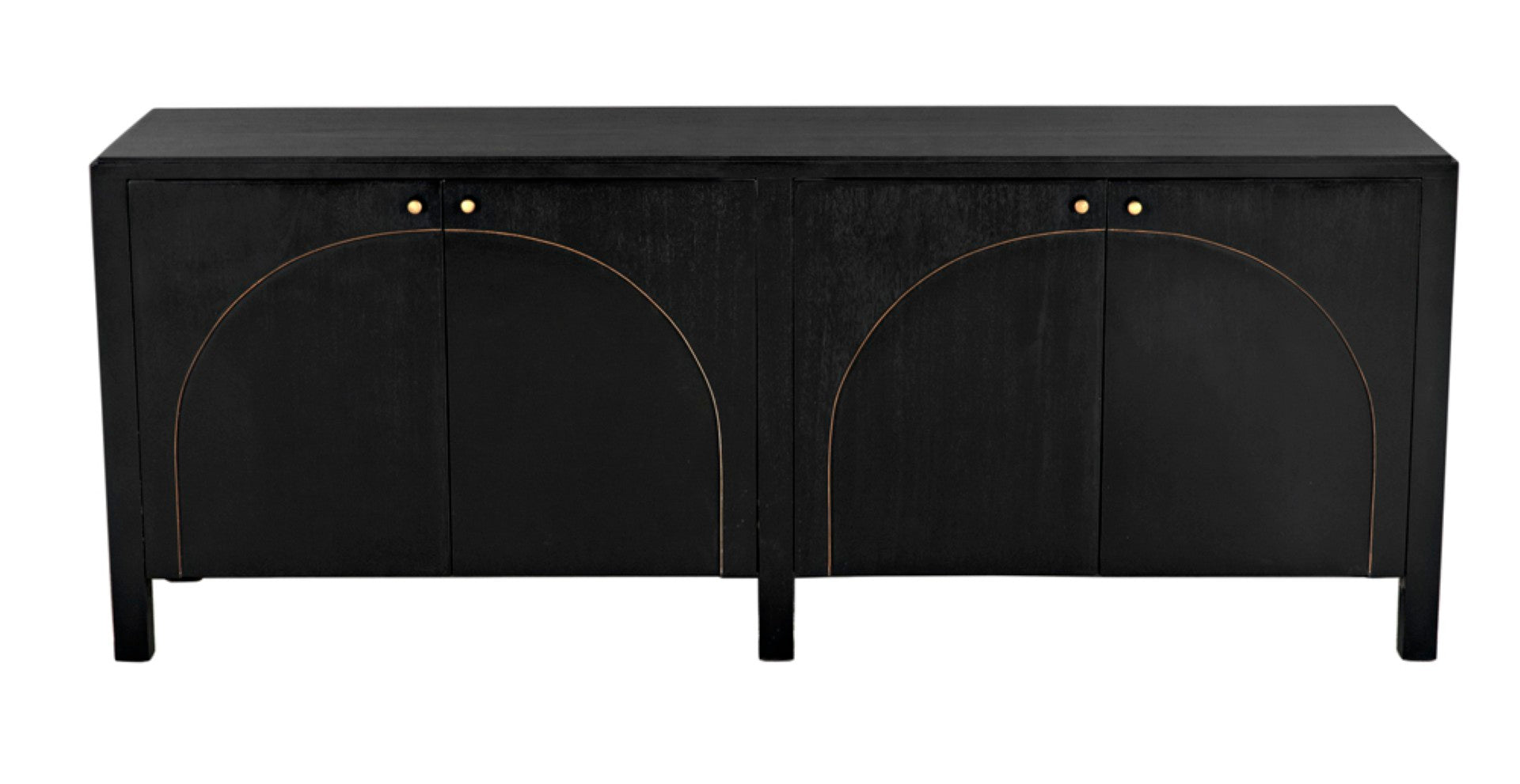Elevate your dining room or entryway with the Weston Sideboard — a refined blend of classic craftsmanship and contemporary lines. Artisan-made from solid mahogany, its hand-rubbed black finish and light brown trim accentuate the arched door detailing and brass pulls, creating a statement piece that is both elegant and functional. Ideal for storing dinnerware, linens, or serving essentials, this sideboard brings lasting quality and timeless style to any distinguished home.