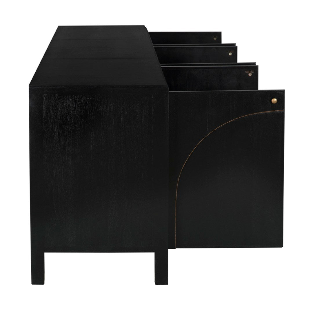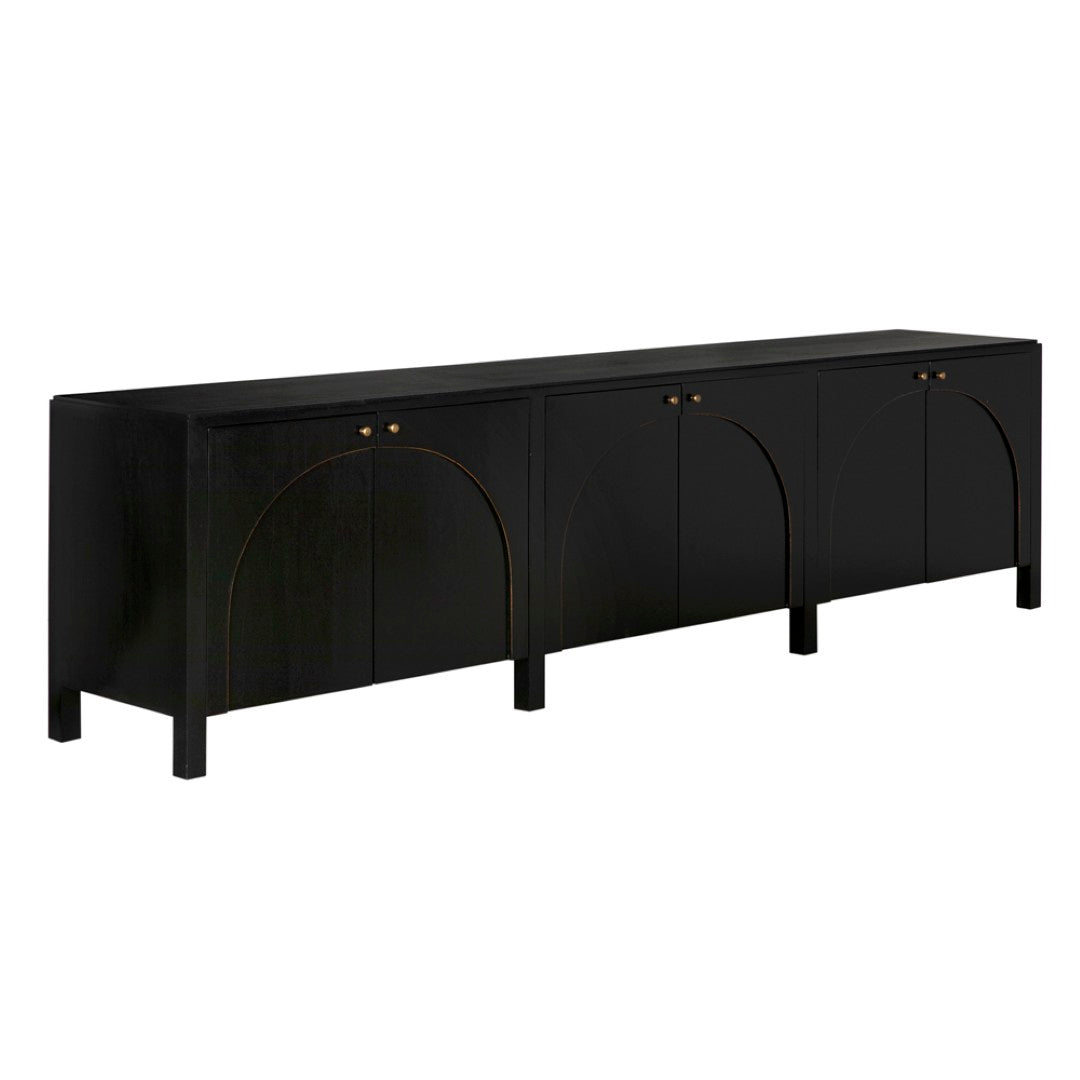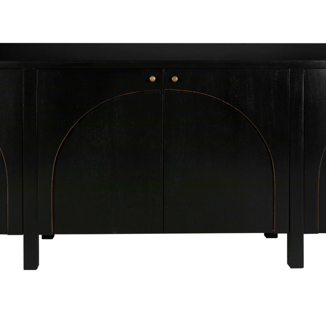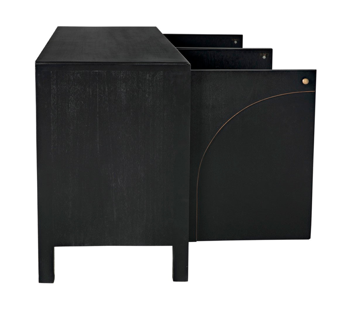 Elevate your dining room or entryway with the Weston Sideboard — a refined blend of classic craftsmanship and contemporary lines. Artisan-made from solid mahogany, its hand-rubbed black finish and light brown trim accentuate the arched door detailing and brass pulls, creating a statement piece that is both elegant and functional. Ideal for storing dinnerware, linens, or serving essentials, this sideboard brings lasting quality and timeless style to any distinguished home.
