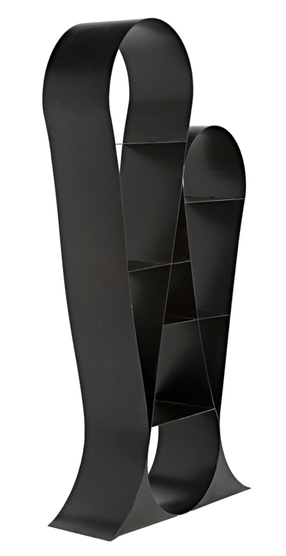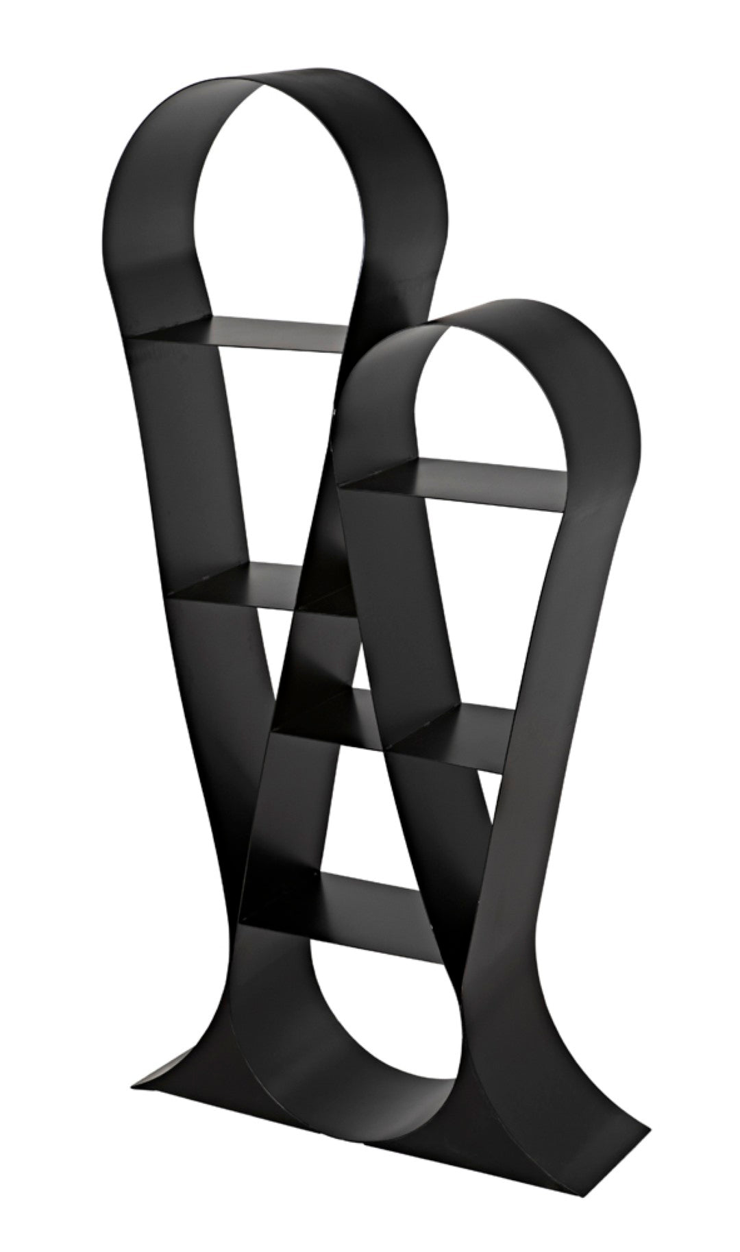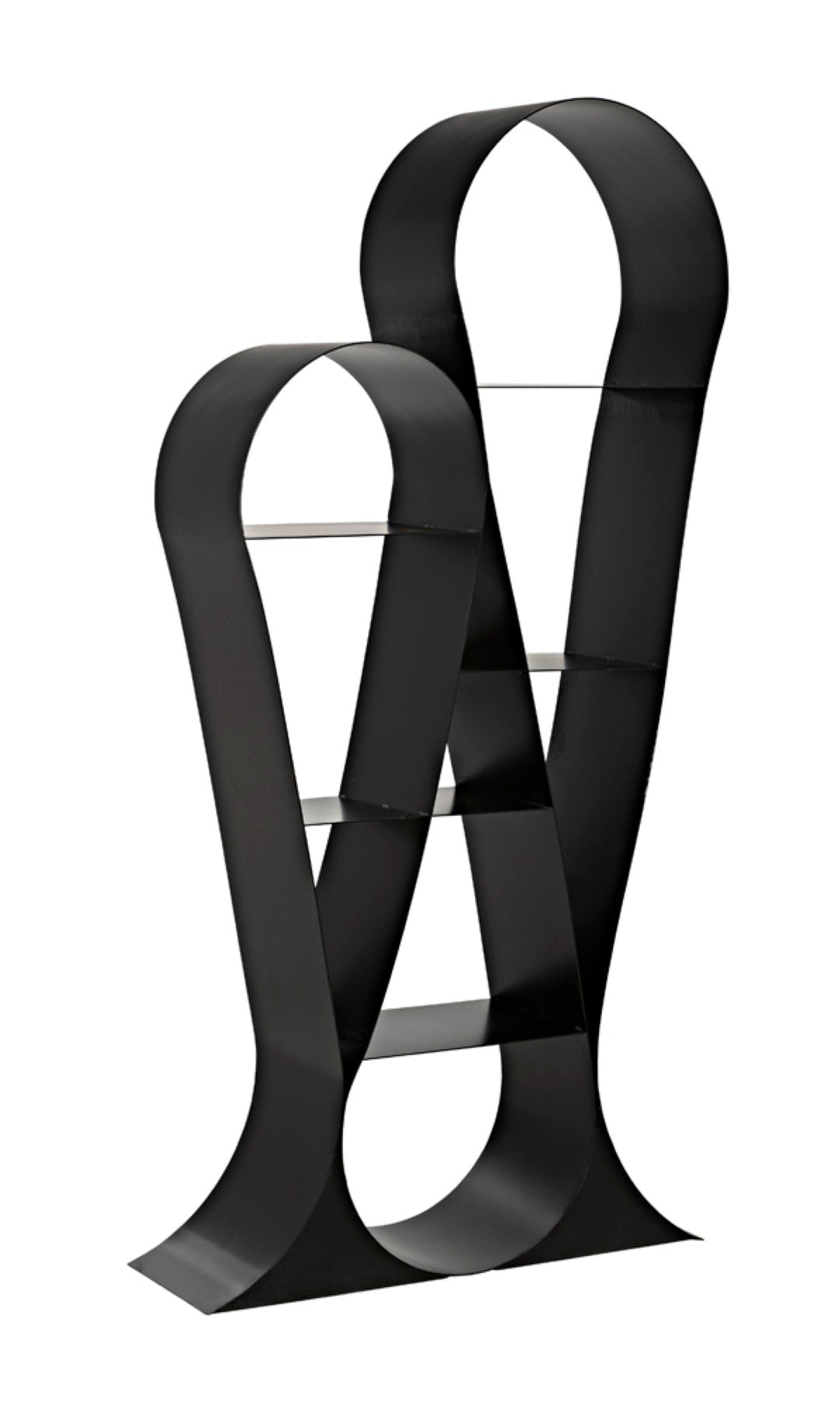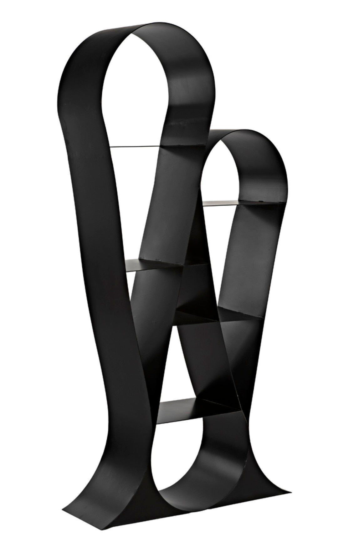 Elevate your living or workspace with this sculptural bookcase that blends industrial strength with refined modern design. Crafted from matte-black iron, its looping ribbon-like forms create an eye-catching silhouette while offering sturdy, open shelving that showcases books, art, and decor with effortless style.