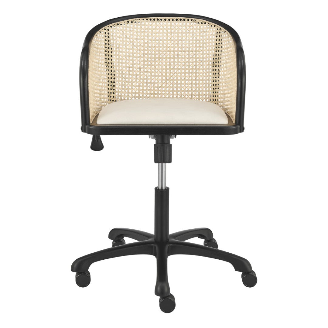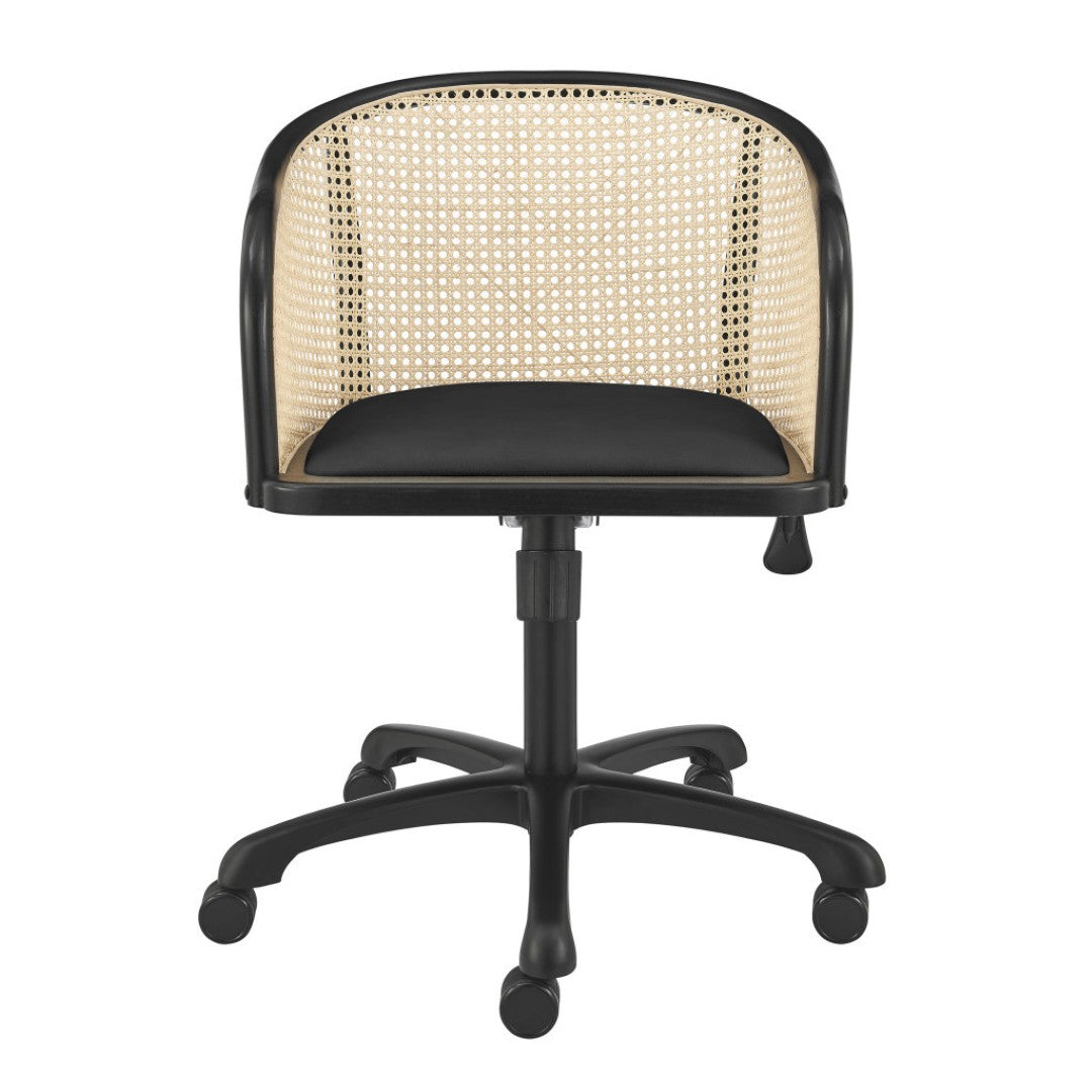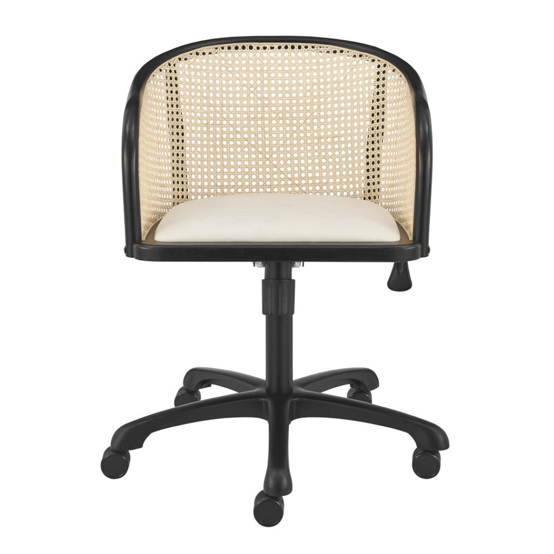 - Enjoy a modern design with a stylish black frame and luxurious natural cane rattan with a black velvet cushioned seat.