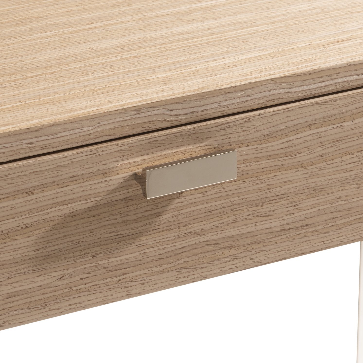 - Desk with engineered veneers in Sahara finish. Polished Stainless Steel support panel on right end of desk and visible on desk top. Desk is finished on all sides.