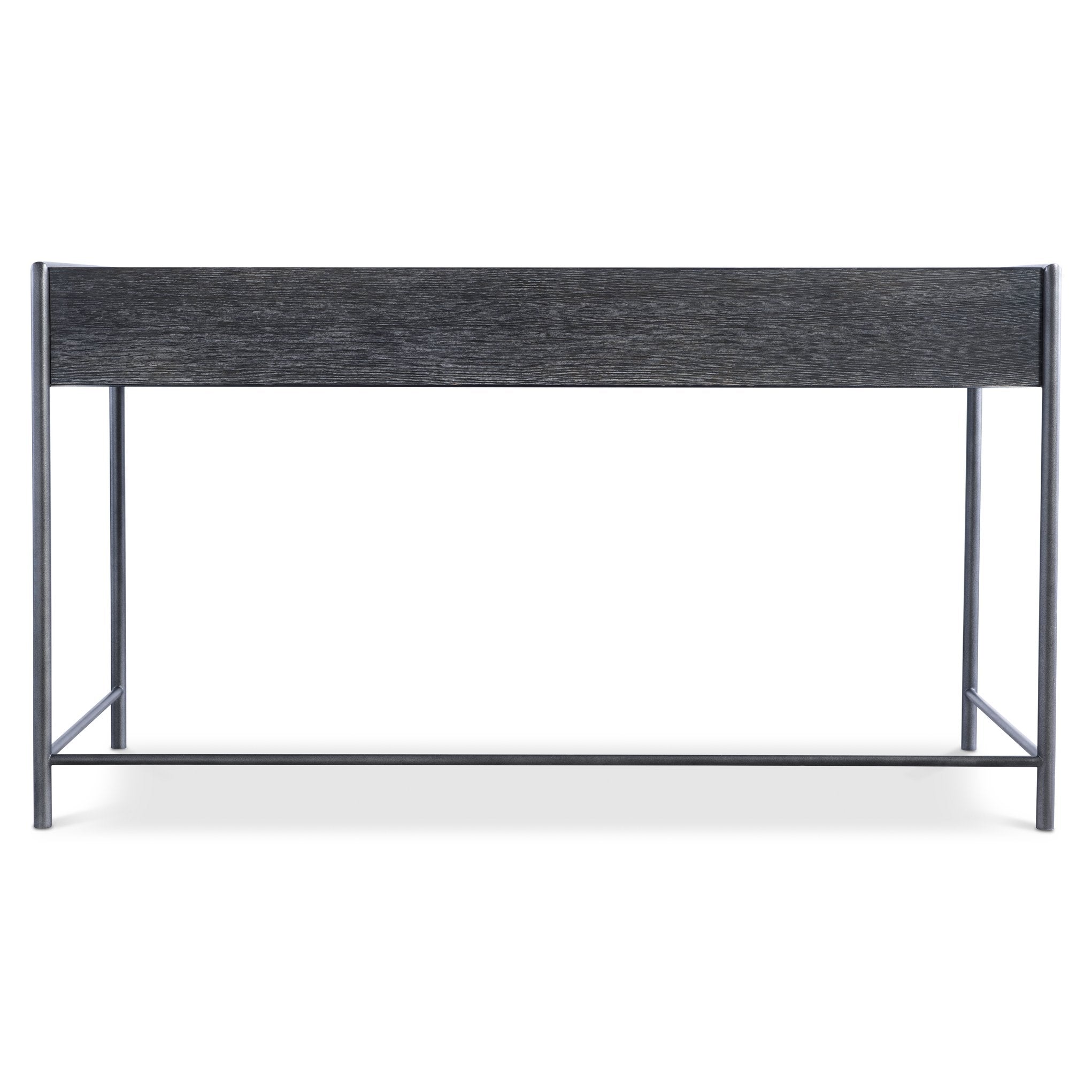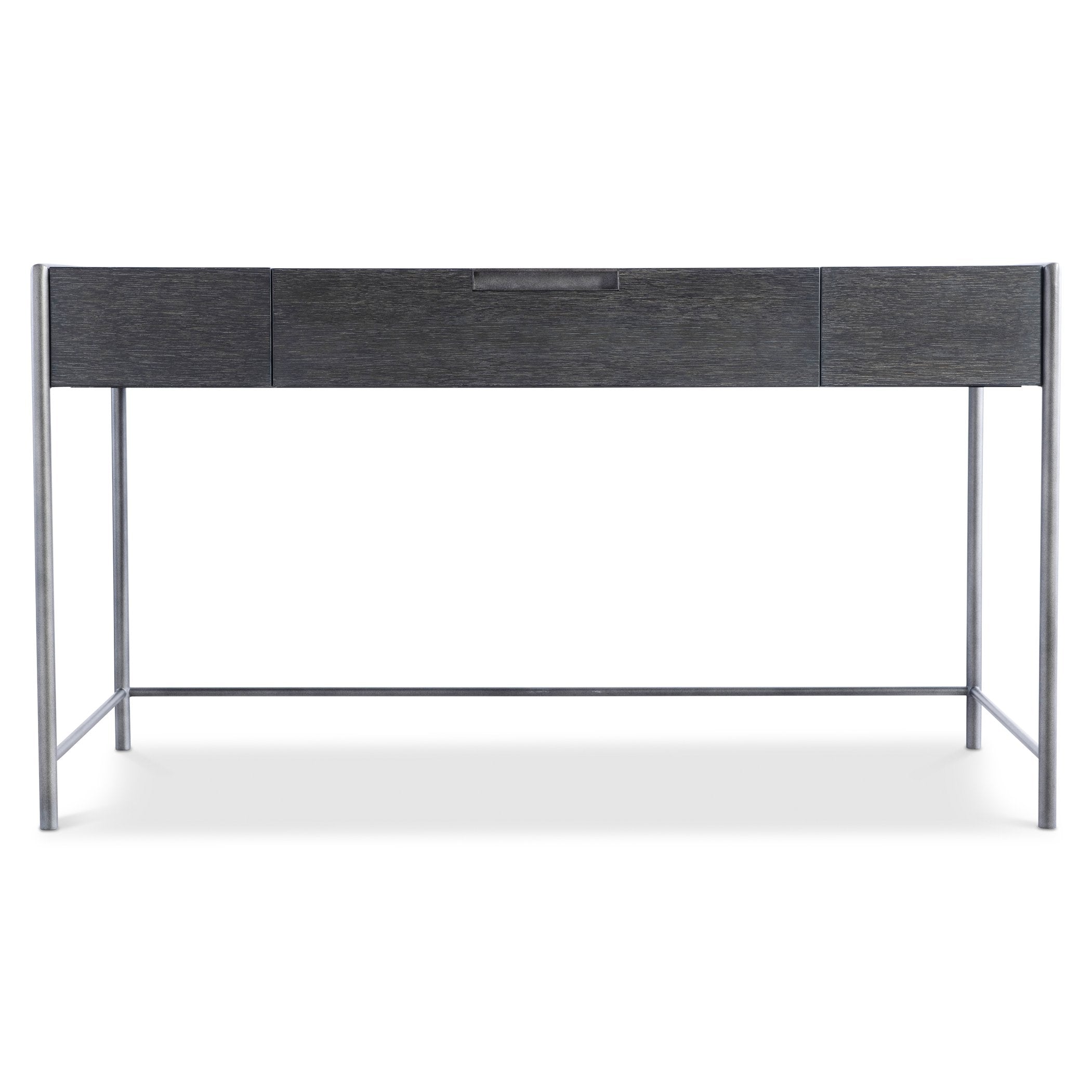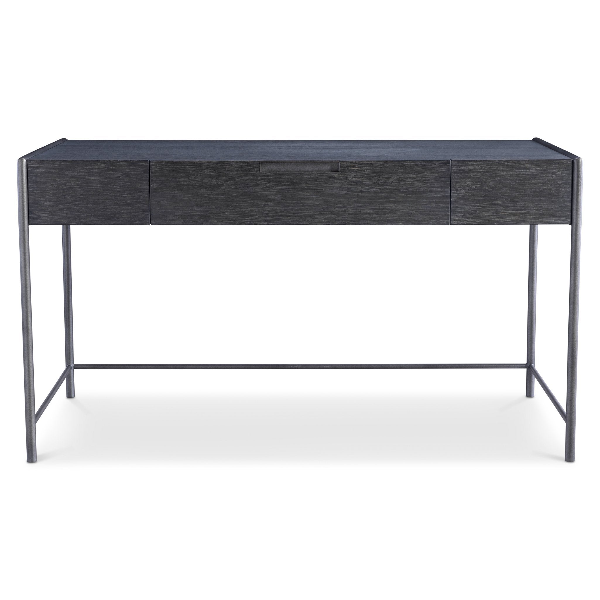 - Applied textured steel frame finished in Atra that wraps around the desktop and extends to form sleek legs