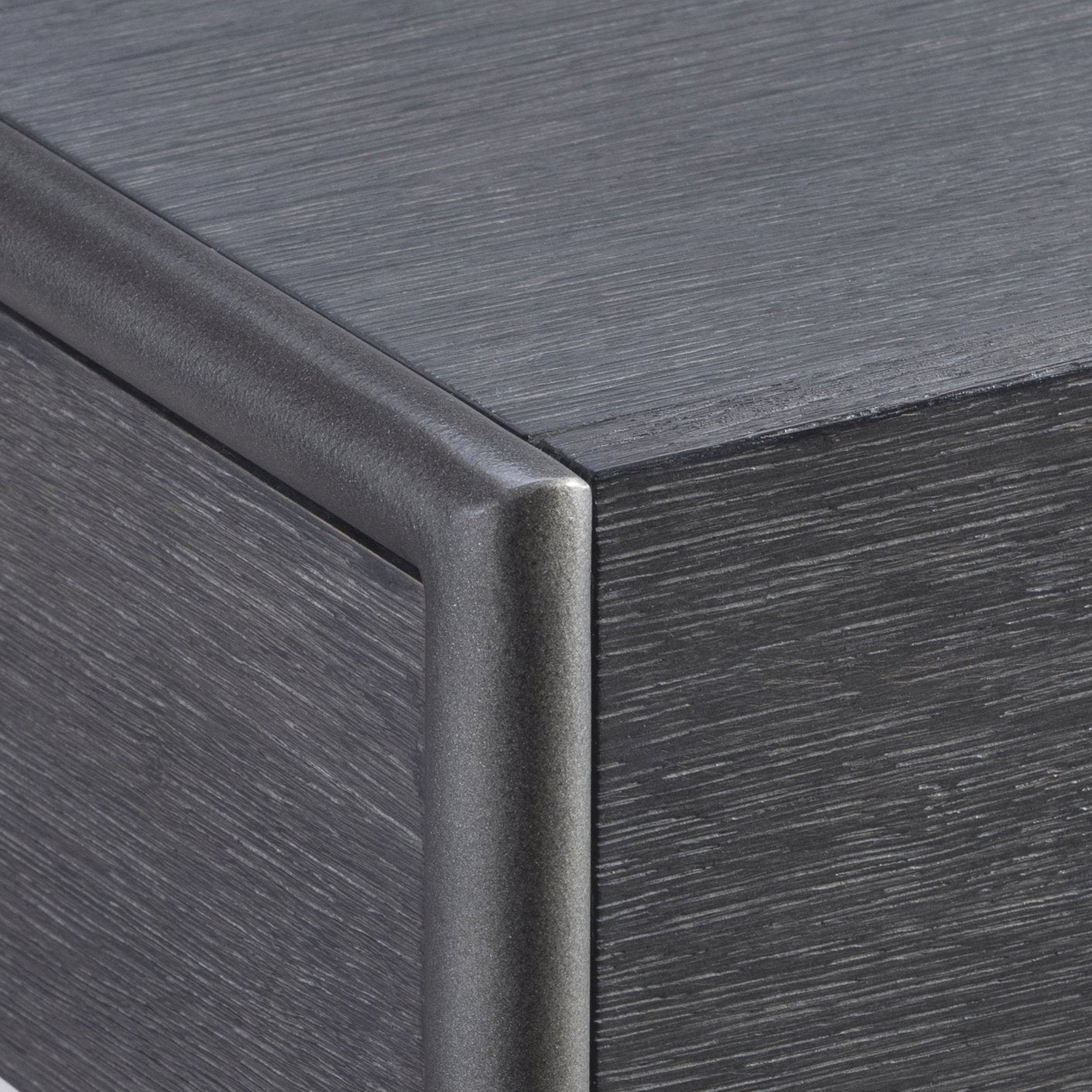 - Wire-brushed oak in Kohl finish with applied textured steel frame in Atra finish