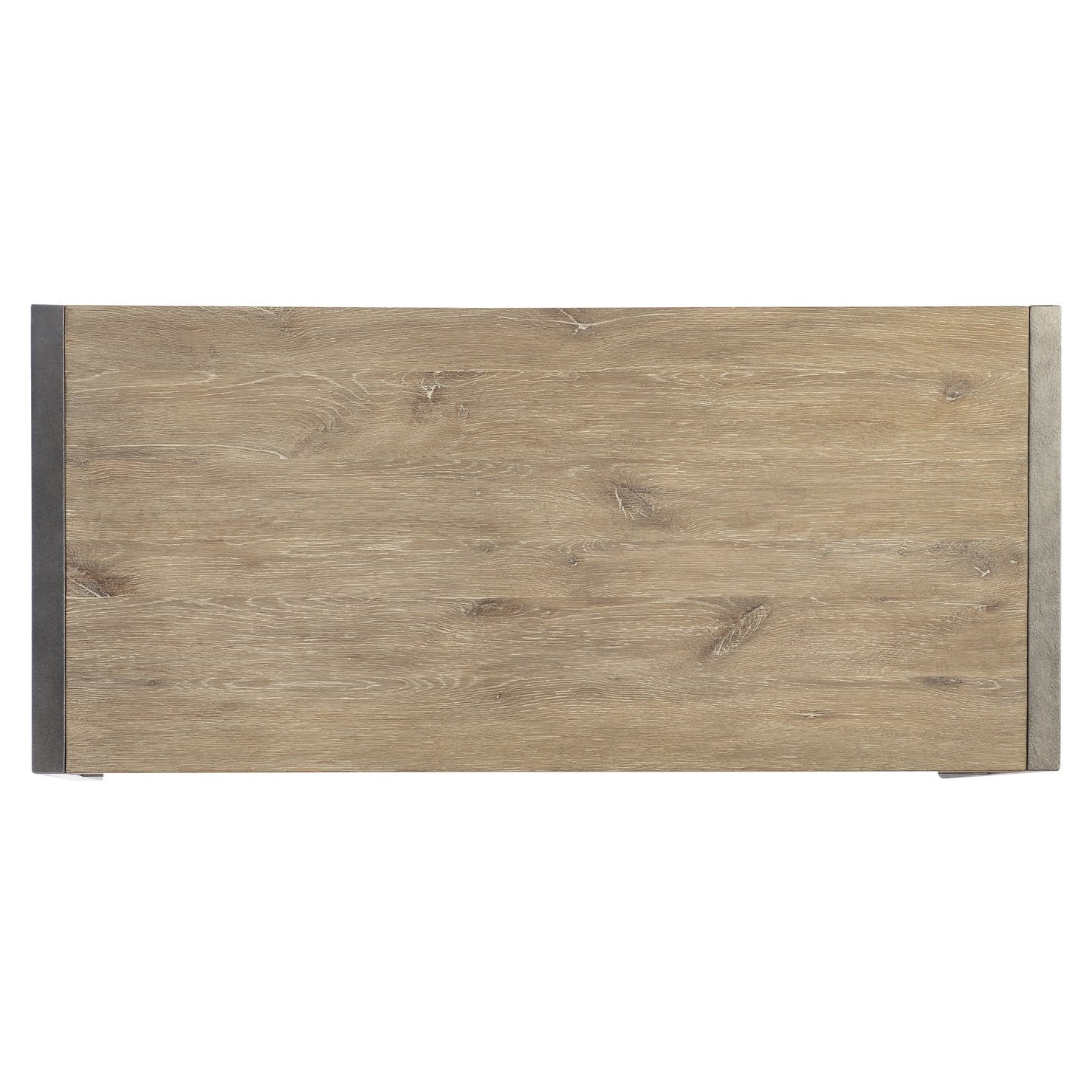 - Oak case in Aurum finish, supported by oak end panels in Aurum finish, framed by textured steel in Barlow finish with stretcher in Barlow finish