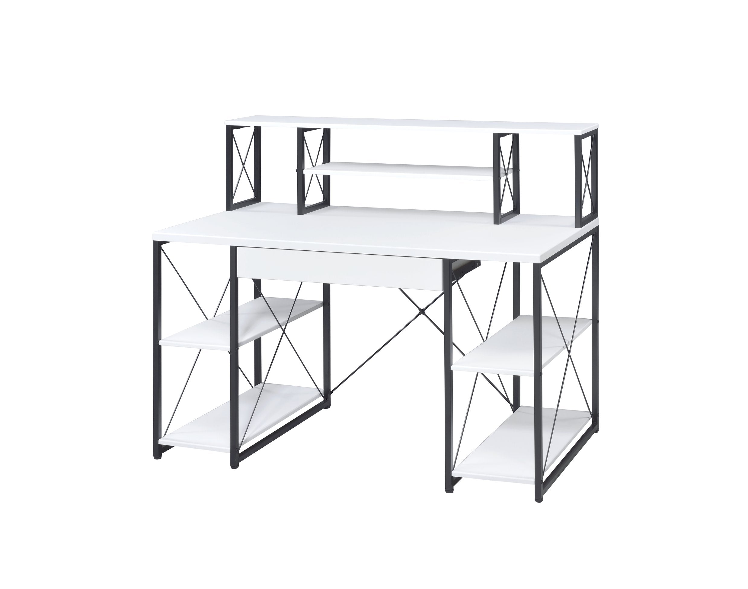 Elevate your workspace with the Amiel All-Purpose White Finish Writing Desk — a versatile, modern desk designed for writing, home offices, or a compact music/recording setup. Clean white veneer surfaces and a durable black metal sled base combine to deliver a contemporary look with practical storage, targeted compartments for gear or media, and a sturdy worktop that supports monitors and light equipment.