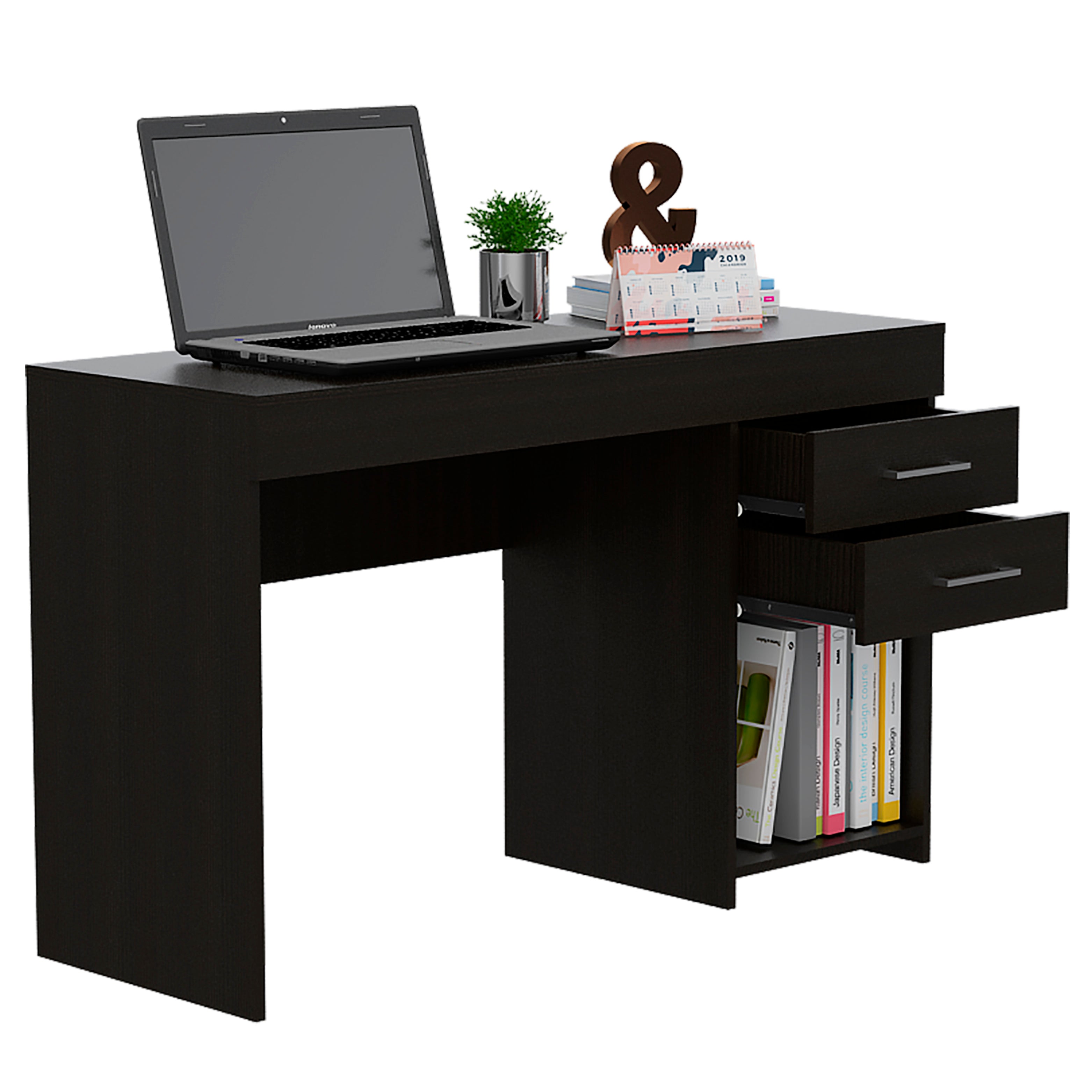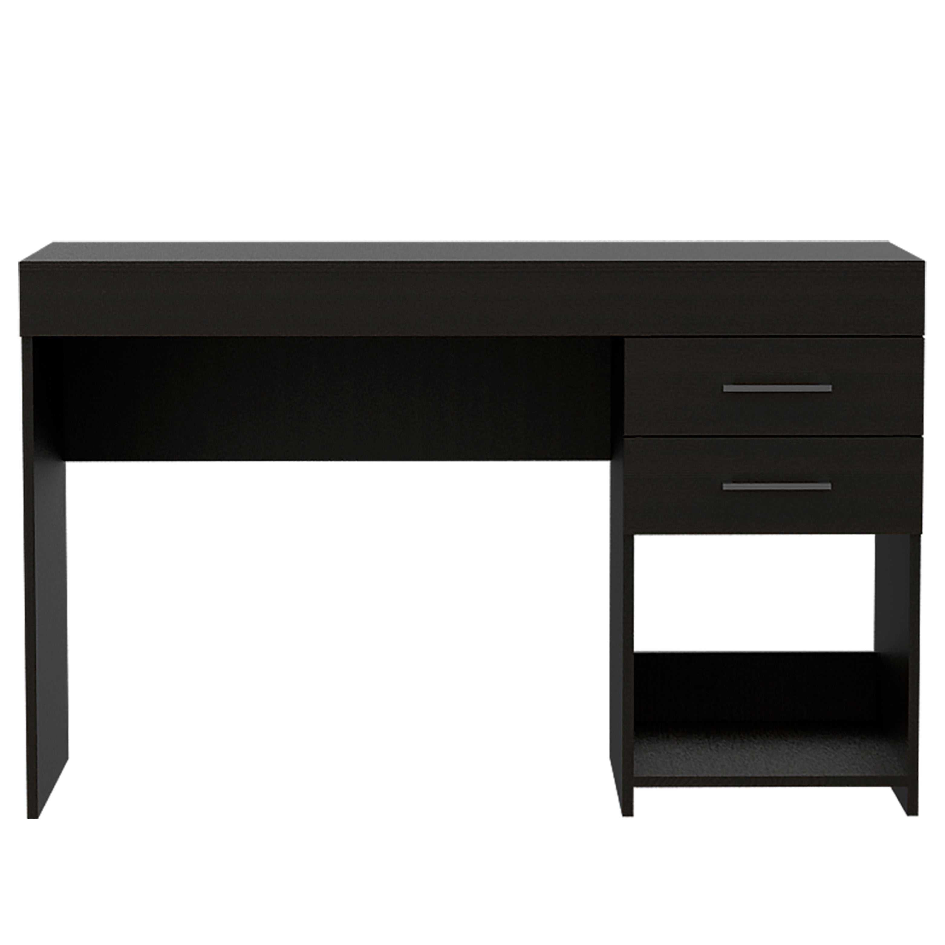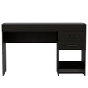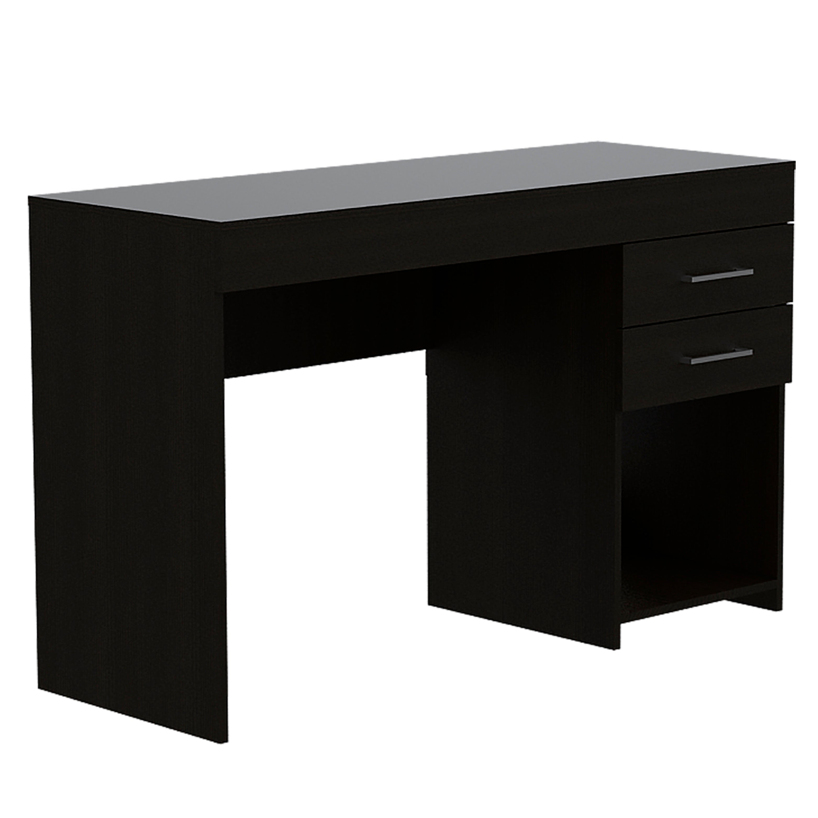Tidy, modern, and built for everyday productivity, this Austin writing computer desk combines a sleek black finish with practical storage to keep your workspace organized. Its compact footprint fits apartments, home offices, or study nooks while providing roomy drawers and an open shelf for books, peripherals, or decor.