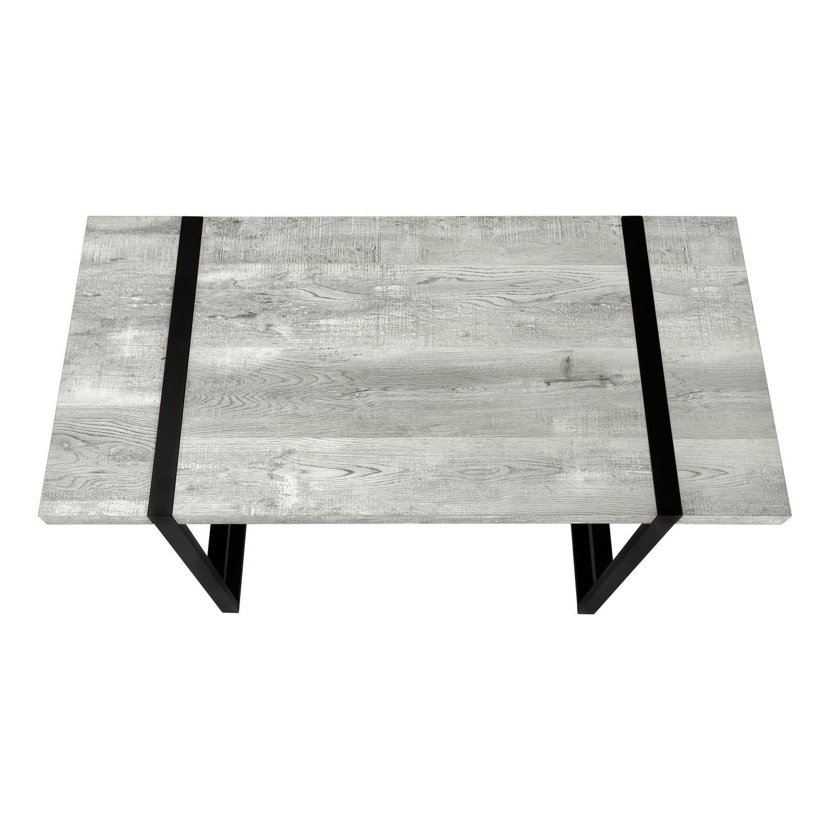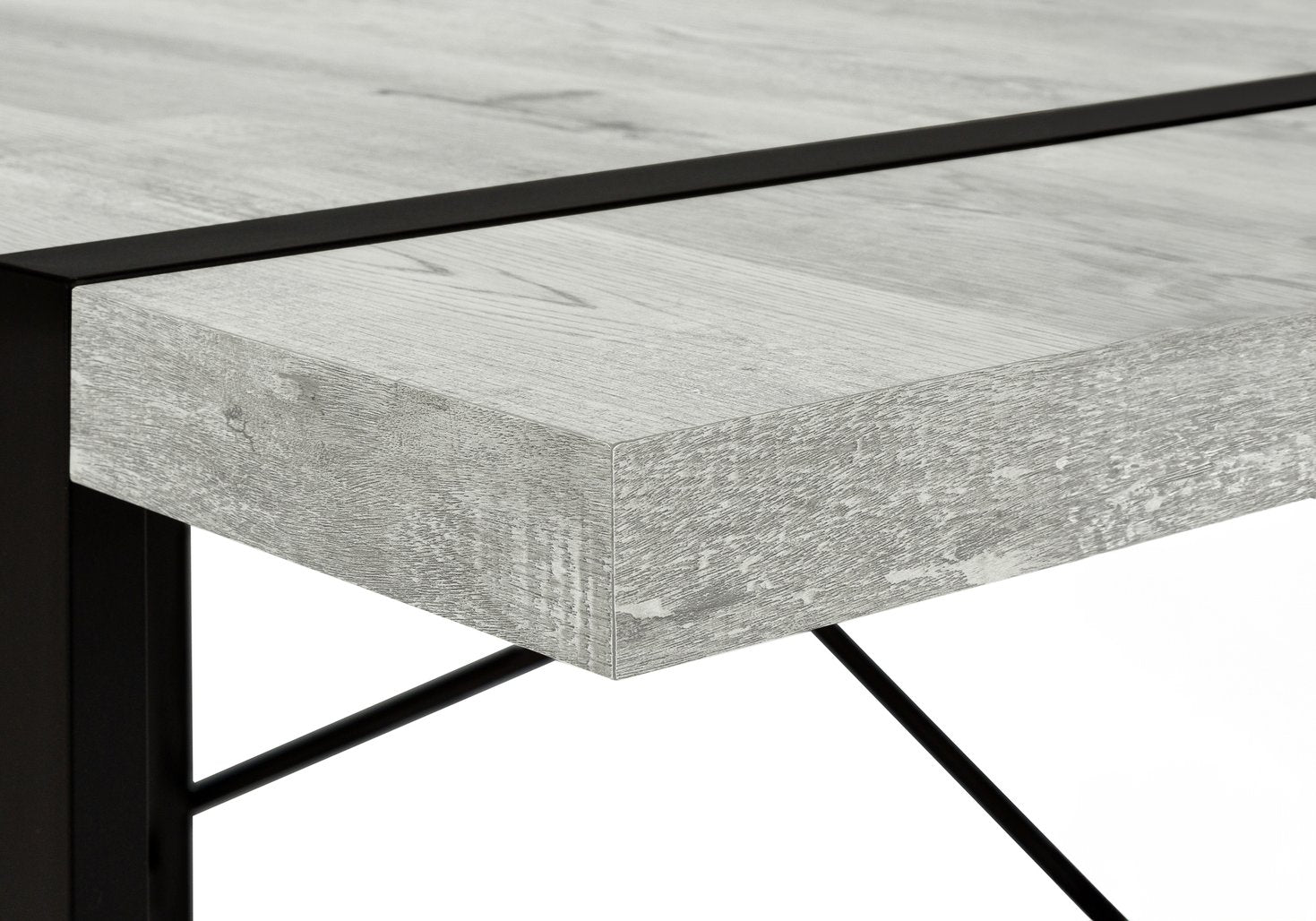 - Grey laminate thick-panel desktop with reclaimed wood-look finish for a contemporary aesthetic