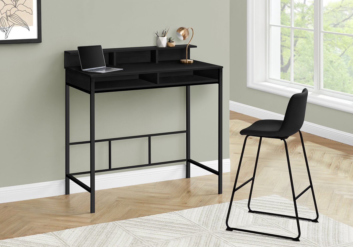 - Color: Black; Materials: Black laminate top and black metal frame for a cohesive, low‑maintenance look.
