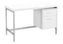 - Sleek, contemporary 48"l computer desk with a white laminate finish and grey metal frame, perfect for working on your laptop, writing, or studying.