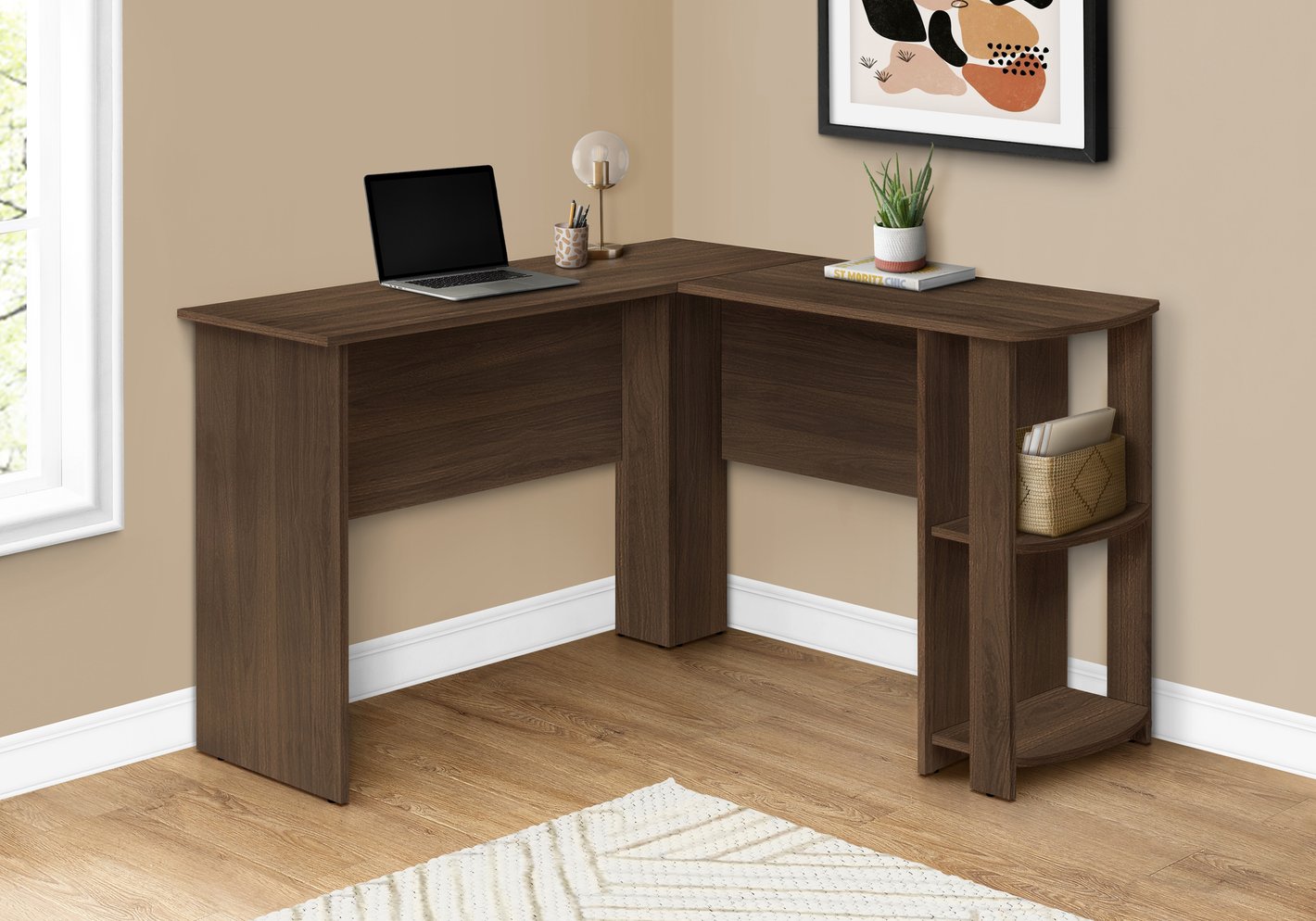- L-shaped computer desk with storage in a wood-look finish