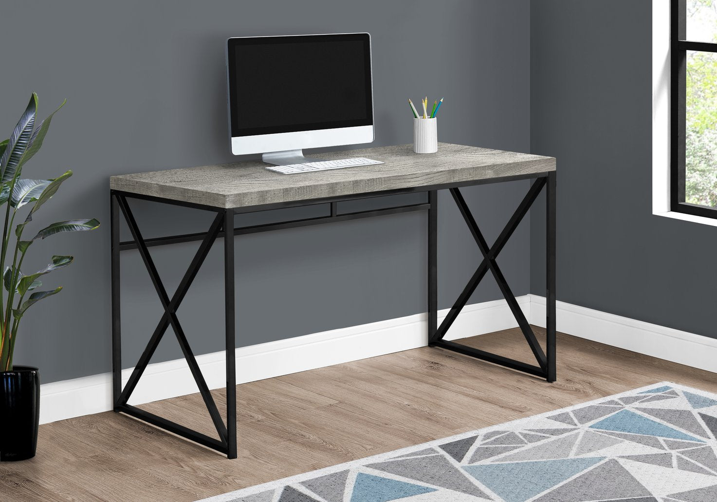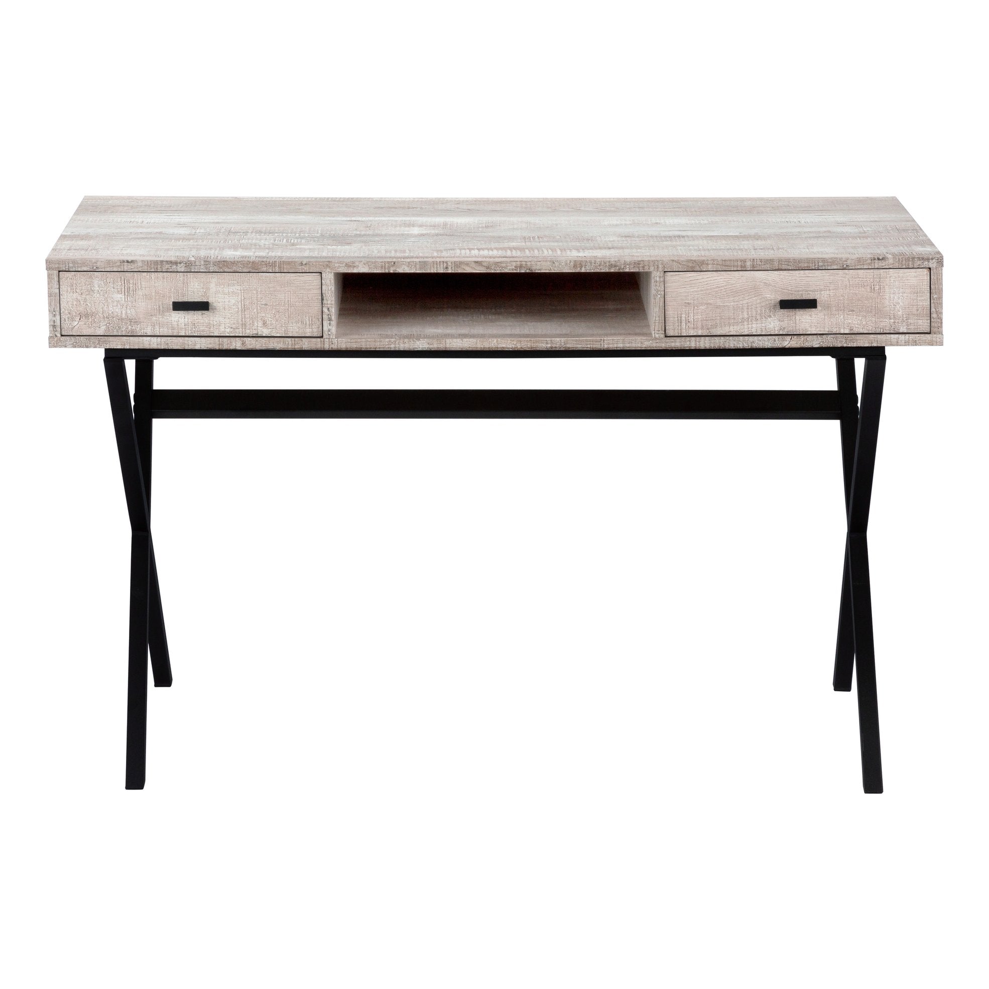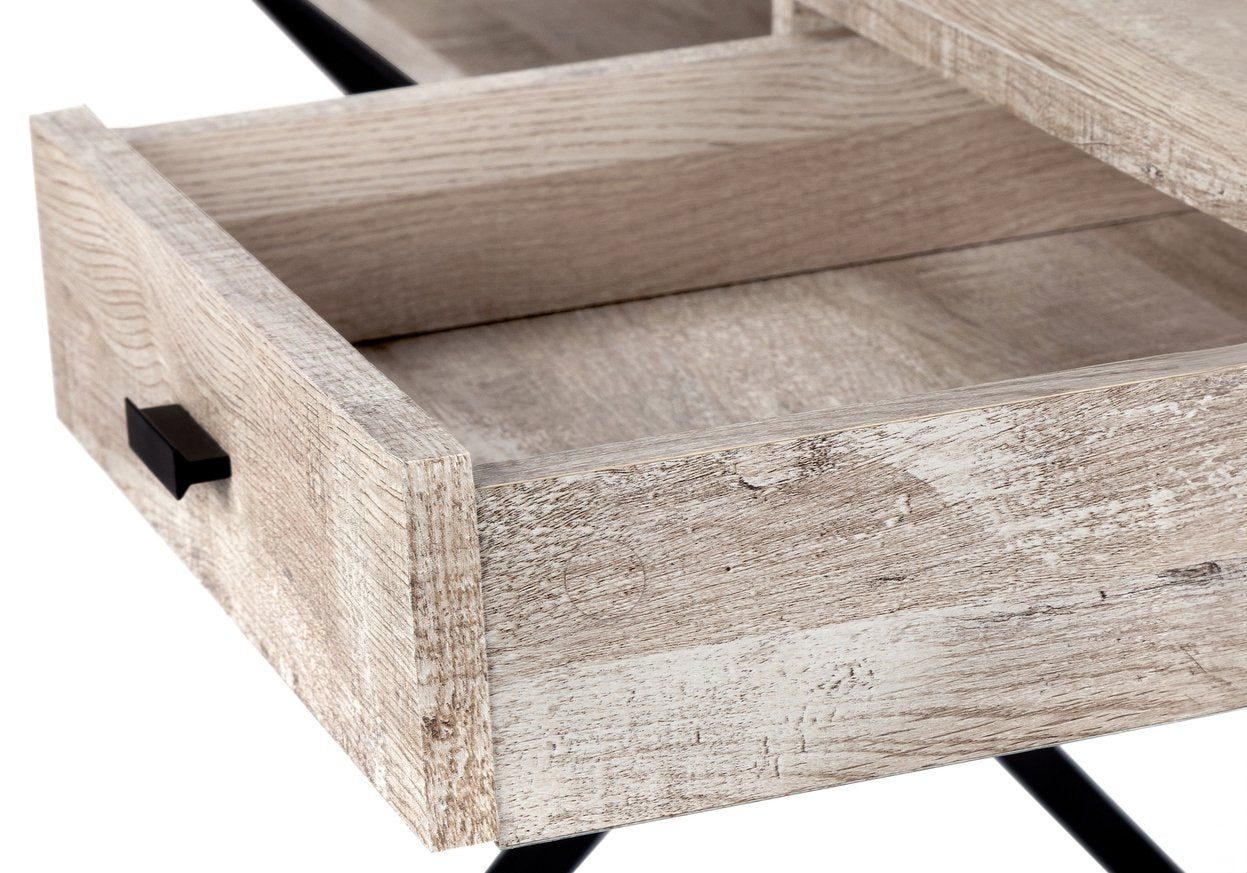 - Work surface: Brown laminate top with a thick, reclaimed-wood look that’s smooth, easy to clean, and finished on all sides.