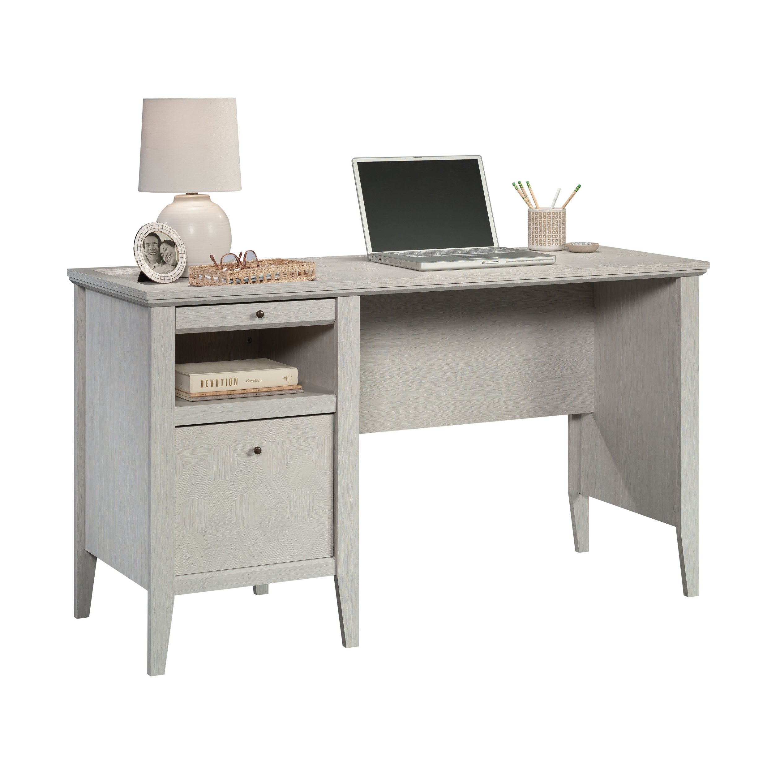 This modern, compact desk in a light grey finish blends clean lines with practical storage to enhance productivity in home offices, bedrooms, or study nooks. Its thoughtful layout and durable engineered wood construction provide a versatile workspace that integrates easily with contemporary décor.
