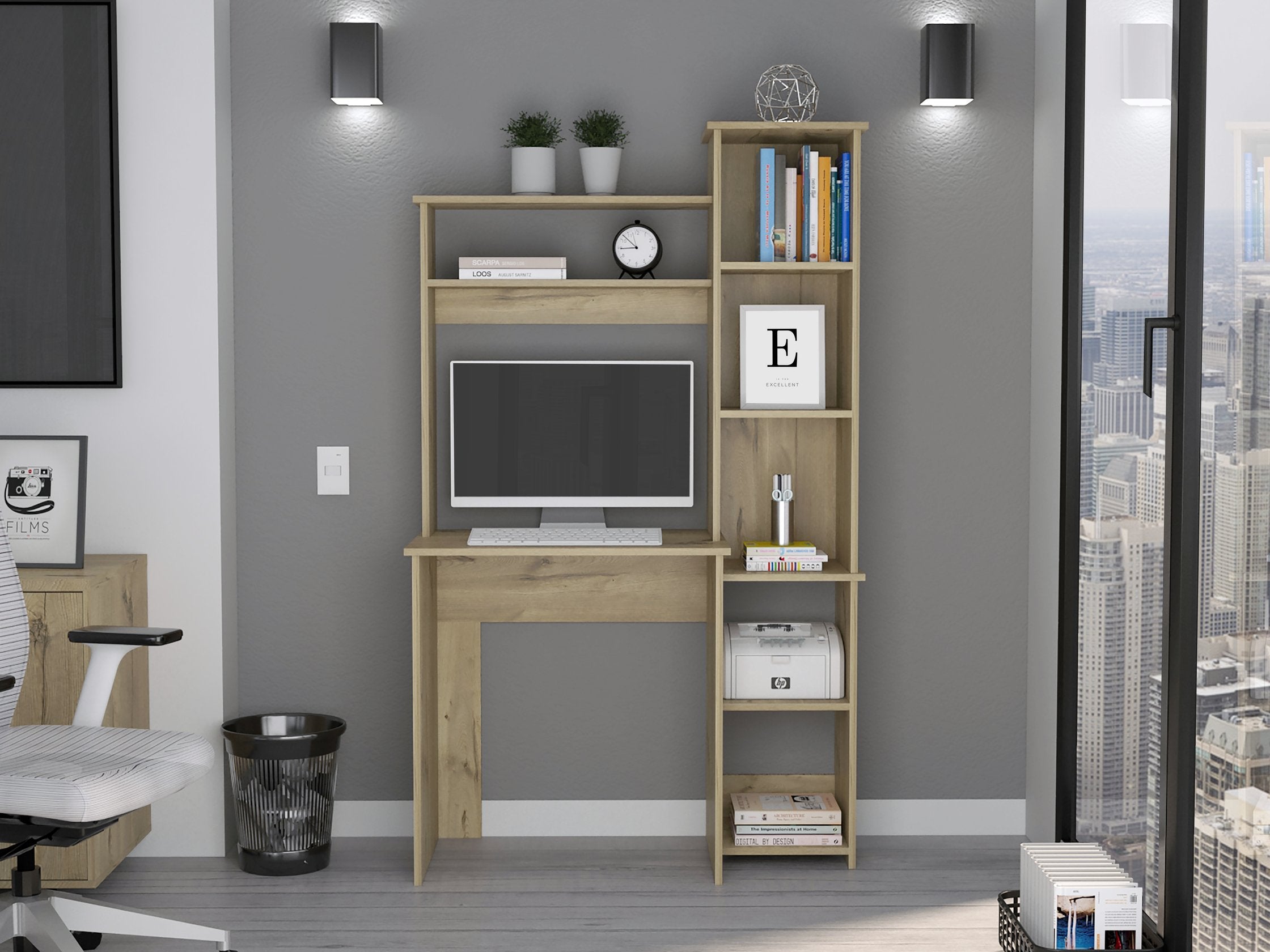 Organize your workspace with the Logan desk—an attractive light oak finish piece engineered for both style and everyday practicality. Thoughtfully arranged cubbies and shelves keep supplies, tech, and décor within easy reach while the central compartment accommodates larger accessories or a monitor. Constructed from durable particle board with a warm woodgrain look, this desk blends into modern and transitional interiors and pairs well with other items from the collection.