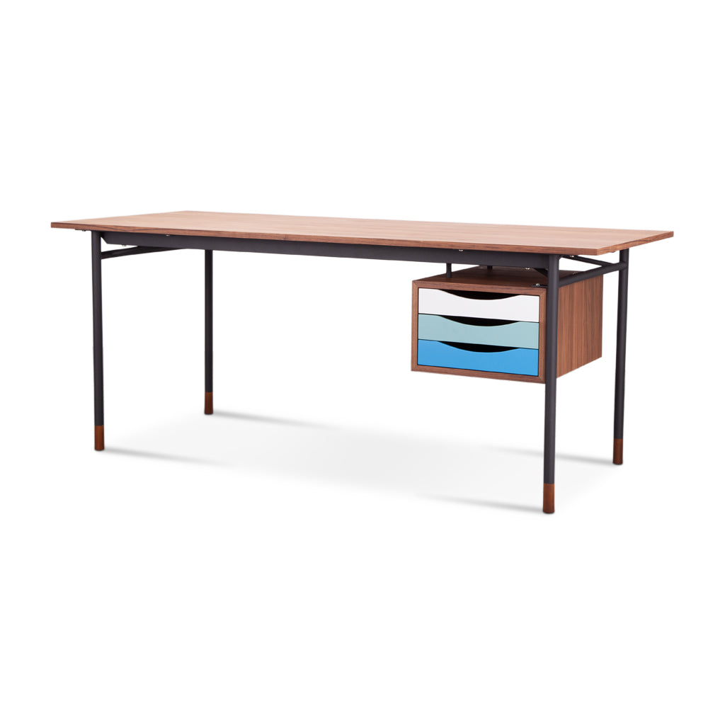 Elevate your workspace with the Finn Juhl–inspired Nyhavn desk in a refined blue and natural walnut finish. This compact, sculptural desk blends mid-century modern character with practical storage and sturdy construction—ideal for home offices, studios, or living rooms where style matters as much as function.