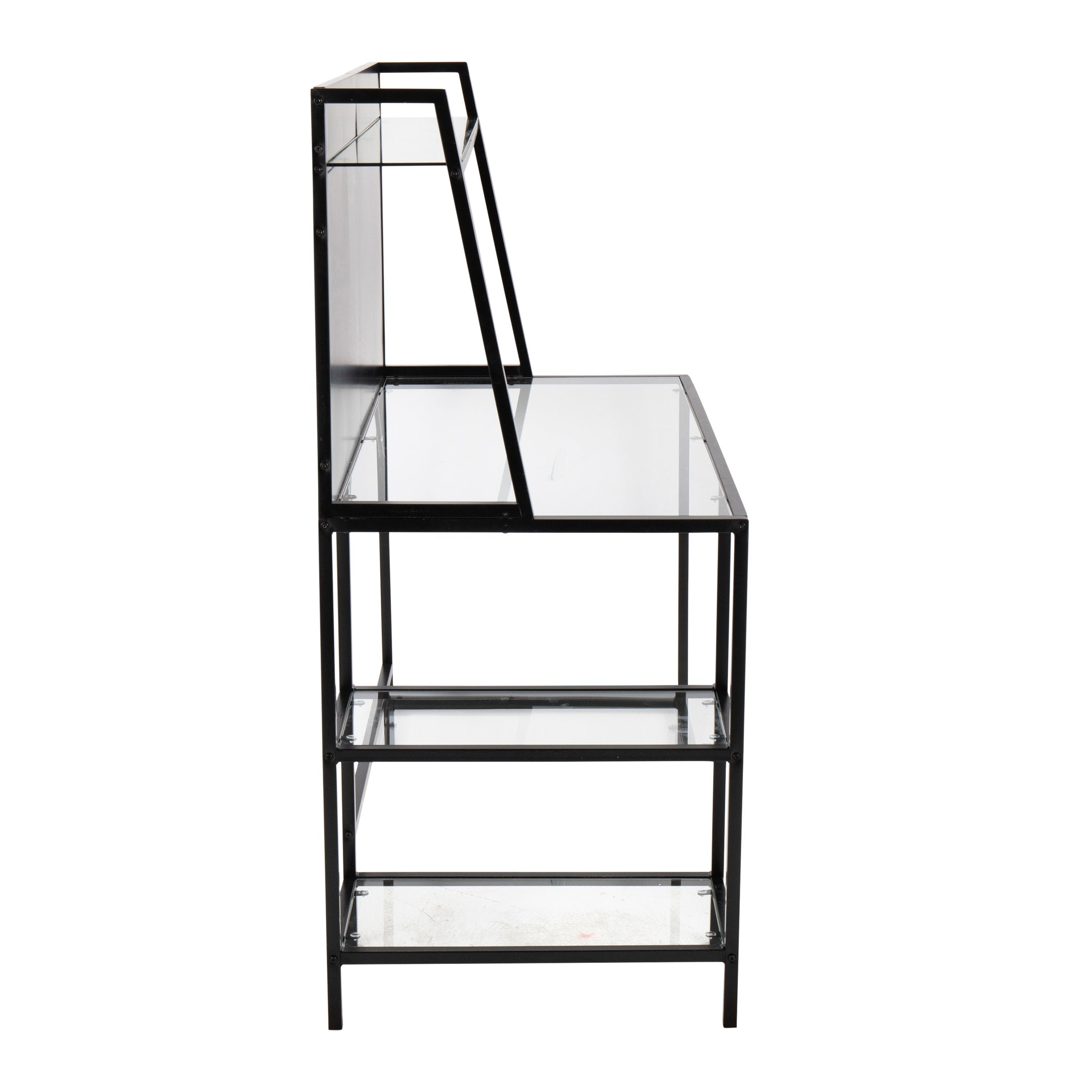 A striking blend of industrial edge and modern minimalism, this contemporary desk pairs a clear glass top with a black metal Geo-tier frame to create a lightweight yet sturdy workspace. Designed for versatility, it offers open shelving for organization and an airy profile that complements home offices, studios, and living spaces without dominating the room.