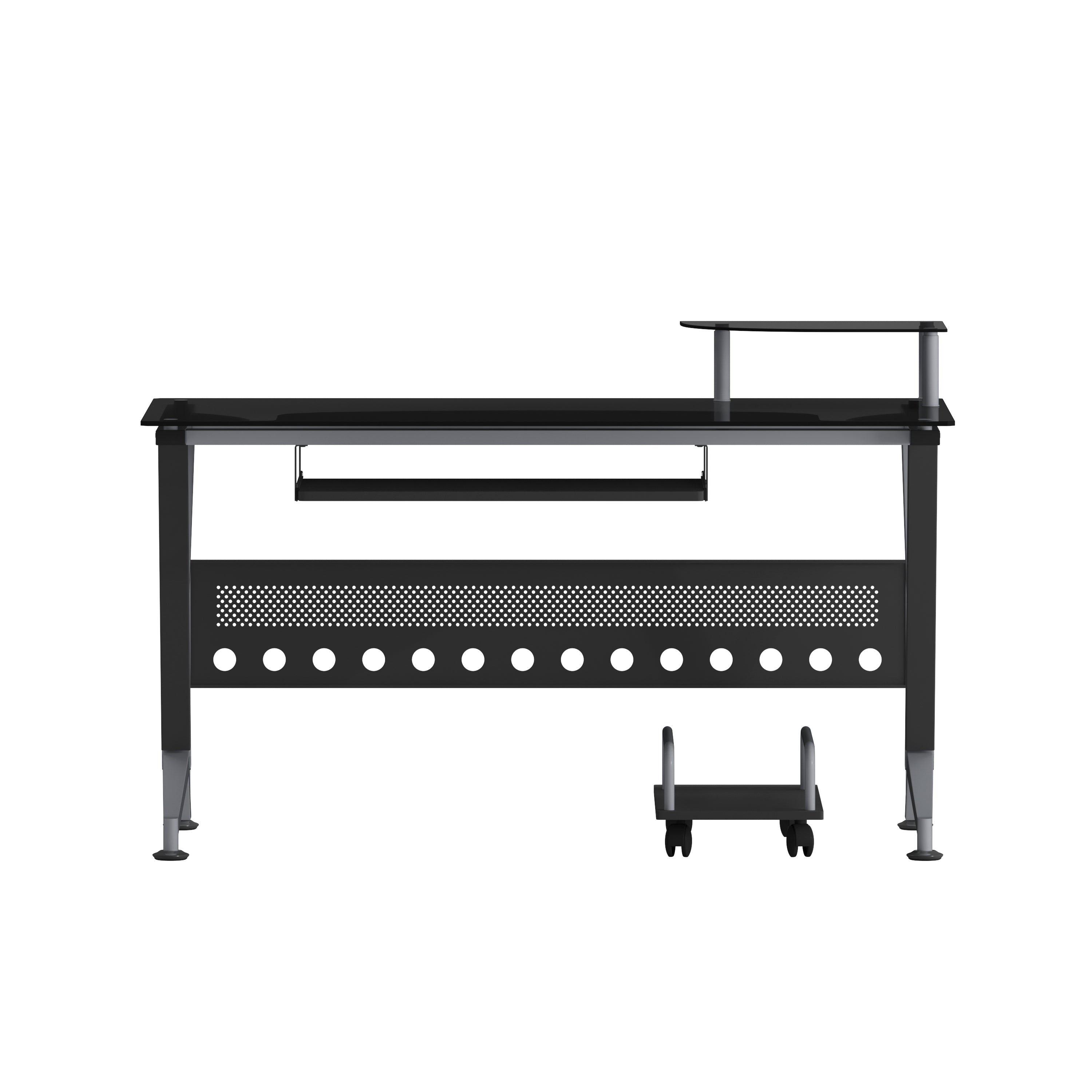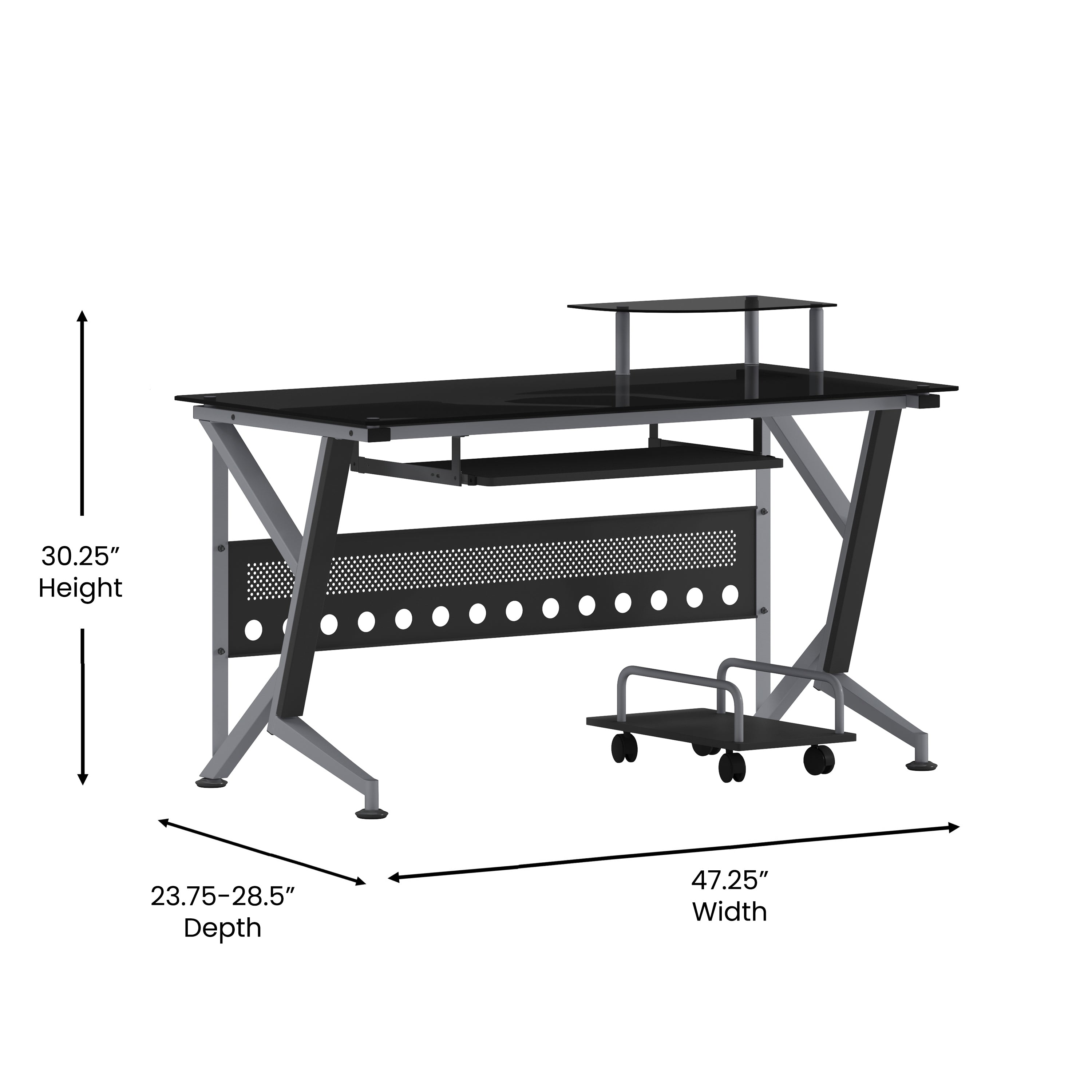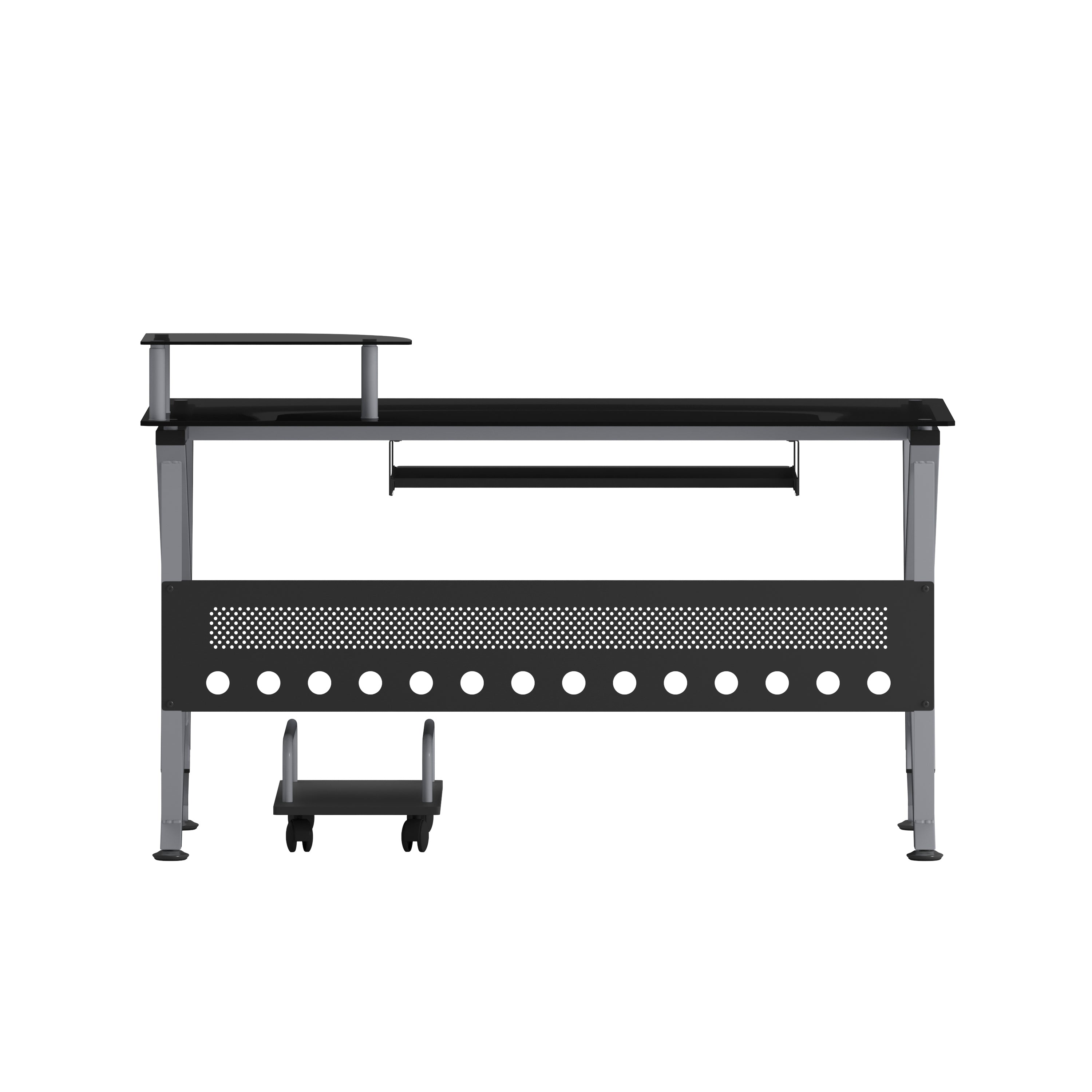 Introducing the Glass Computer Desk with Pull-Out Keyboard Tray and CPU Cart, a sleek and modern addition to any workspace. This contemporary style computer desk features a striking black tempered glass surface, measuring a sturdy 8mm thick, that provides both elegance and durability. The spacious rectangular desktop offers ample room for your computer equipment and accessories, while the built-in monitor platform boasts dimensions of 15.75W x 9.75D x 4.5H from the surface, with a weight capacity of up to 44 lbs. The sliding keyboard tray, positioned at 23.5W x 11.75D x 26.5H from the floor, ensures ergonomic comfort during extended use. For added privacy and stability, a sleek privacy panel complements the desk's silver powder coated frame finish. Equipped with self-leveling floor glides, this desk also includes a mobile CPU cart measuring 9.75W x 17.75D x 6.75H for convenient storage and easy access.