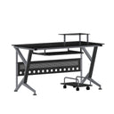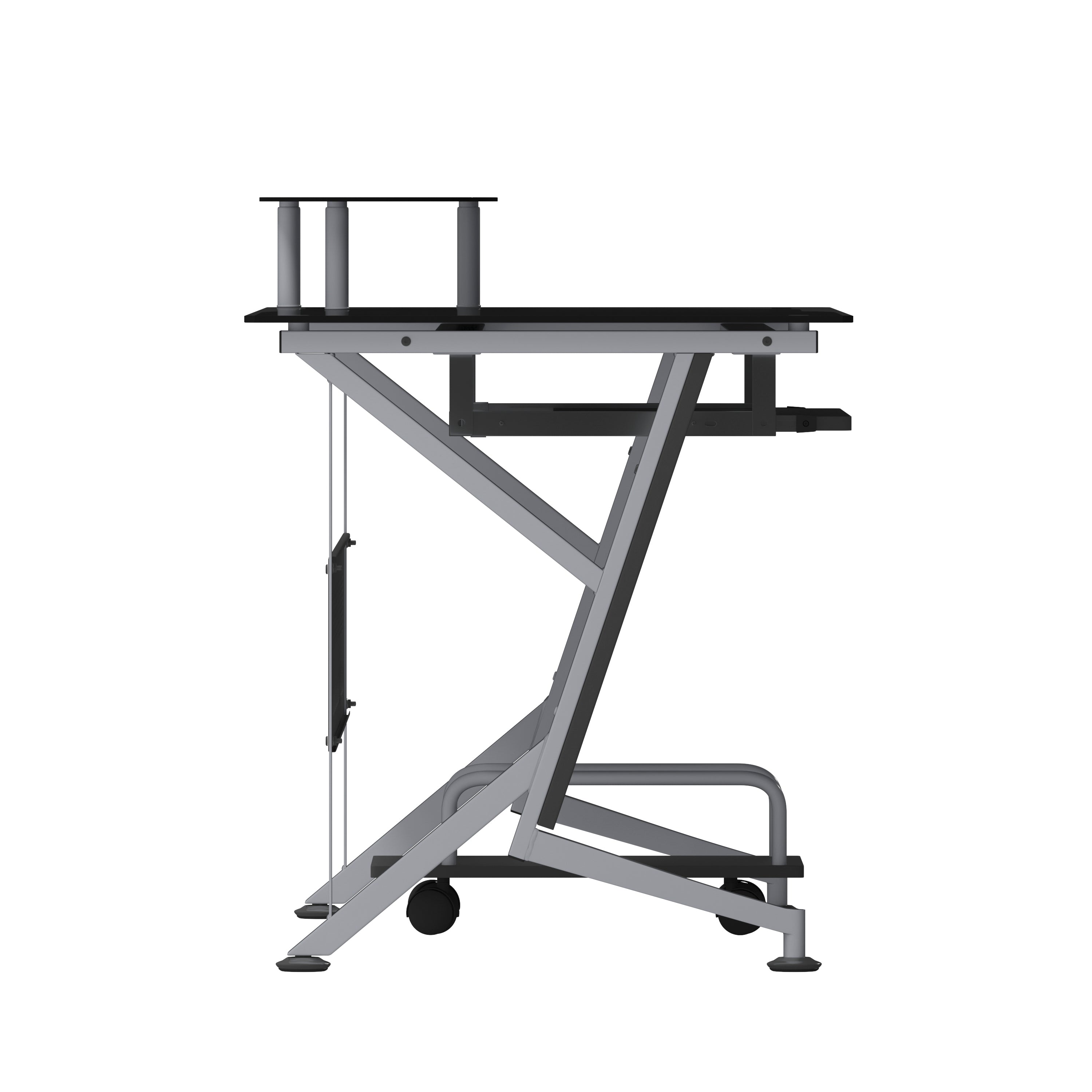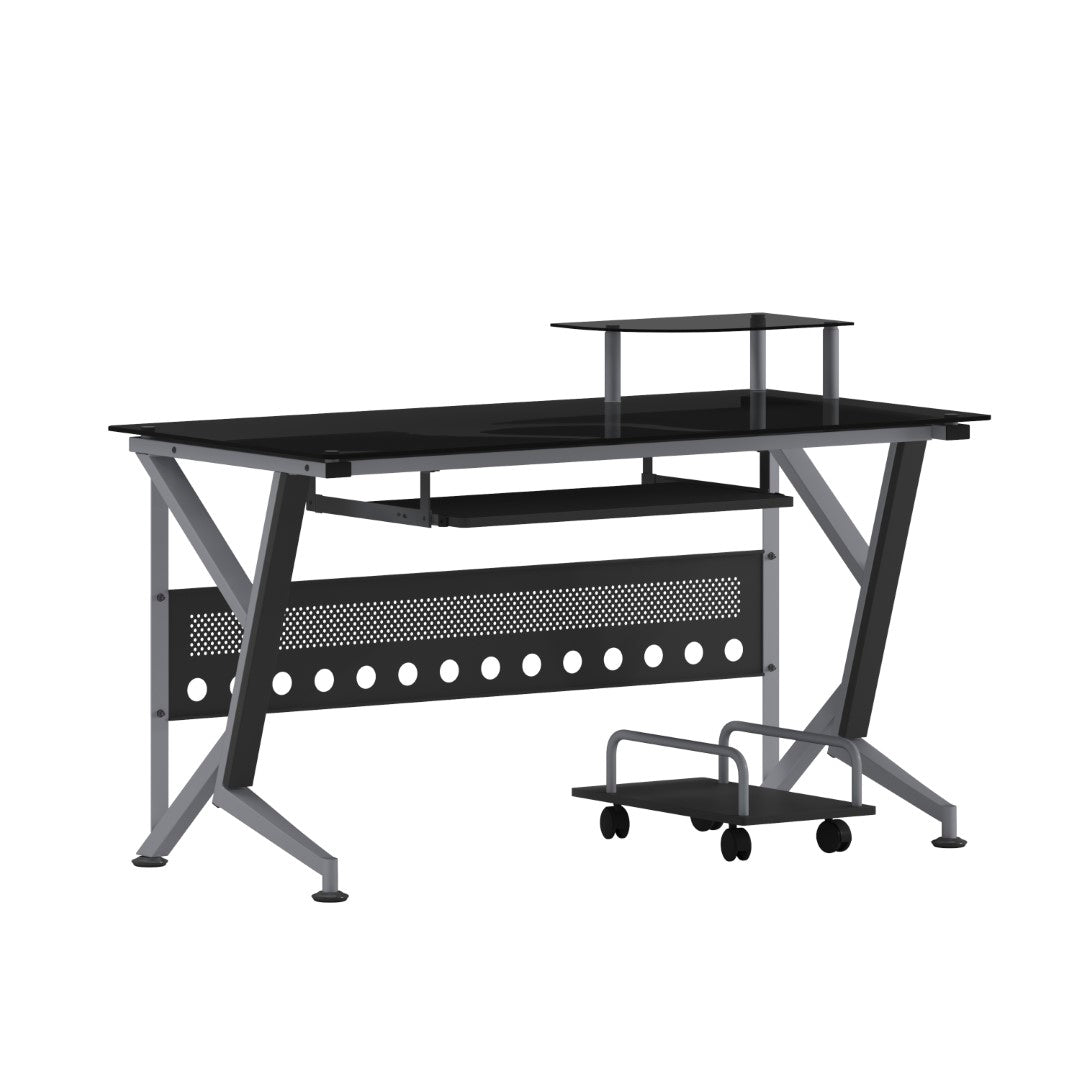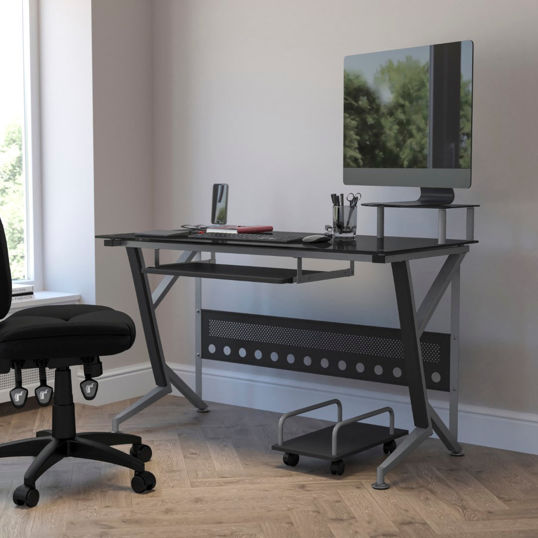 Introducing the Glass Computer Desk with Pull-Out Keyboard Tray and CPU Cart, a sleek and modern addition to any workspace. This contemporary style computer desk features a striking black tempered glass surface, measuring a sturdy 8mm thick, that provides both elegance and durability. The spacious rectangular desktop offers ample room for your computer equipment and accessories, while the built-in monitor platform boasts dimensions of 15.75W x 9.75D x 4.5H from the surface, with a weight capacity of up to 44 lbs. The sliding keyboard tray, positioned at 23.5W x 11.75D x 26.5H from the floor, ensures ergonomic comfort during extended use. For added privacy and stability, a sleek privacy panel complements the desk's silver powder coated frame finish. Equipped with self-leveling floor glides, this desk also includes a mobile CPU cart measuring 9.75W x 17.75D x 6.75H for convenient storage and easy access.