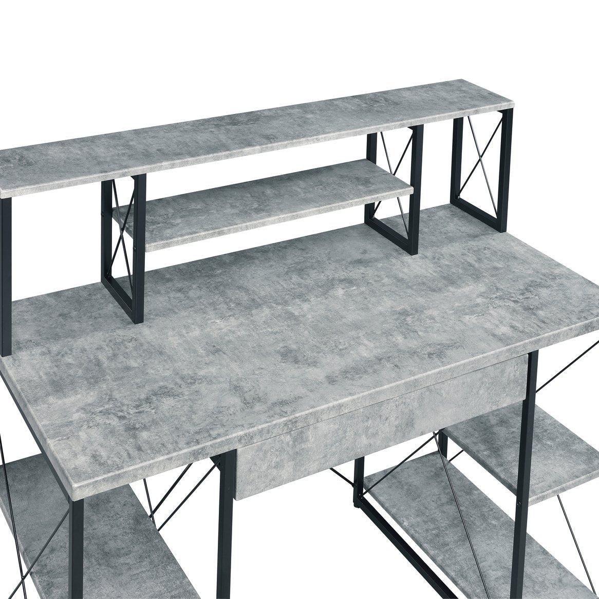 - Included: One (1) writing desk with hutch and open shelving configuration.