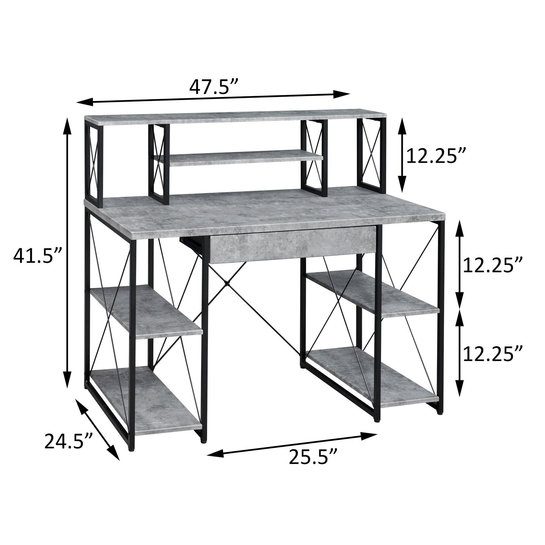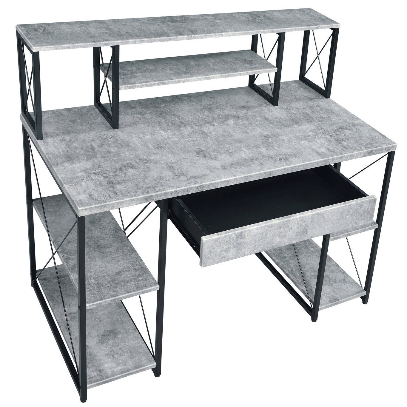 Create a professional, organized workspace with this grey and black office desk designed for home studios, small offices, or creative work areas. The combination of a warm wooden top, open shelving, and a roomy drawer provides thoughtful storage and surface options so your monitors, instruments, and accessories stay accessible and neatly arranged while maintaining a modern, industrial look.