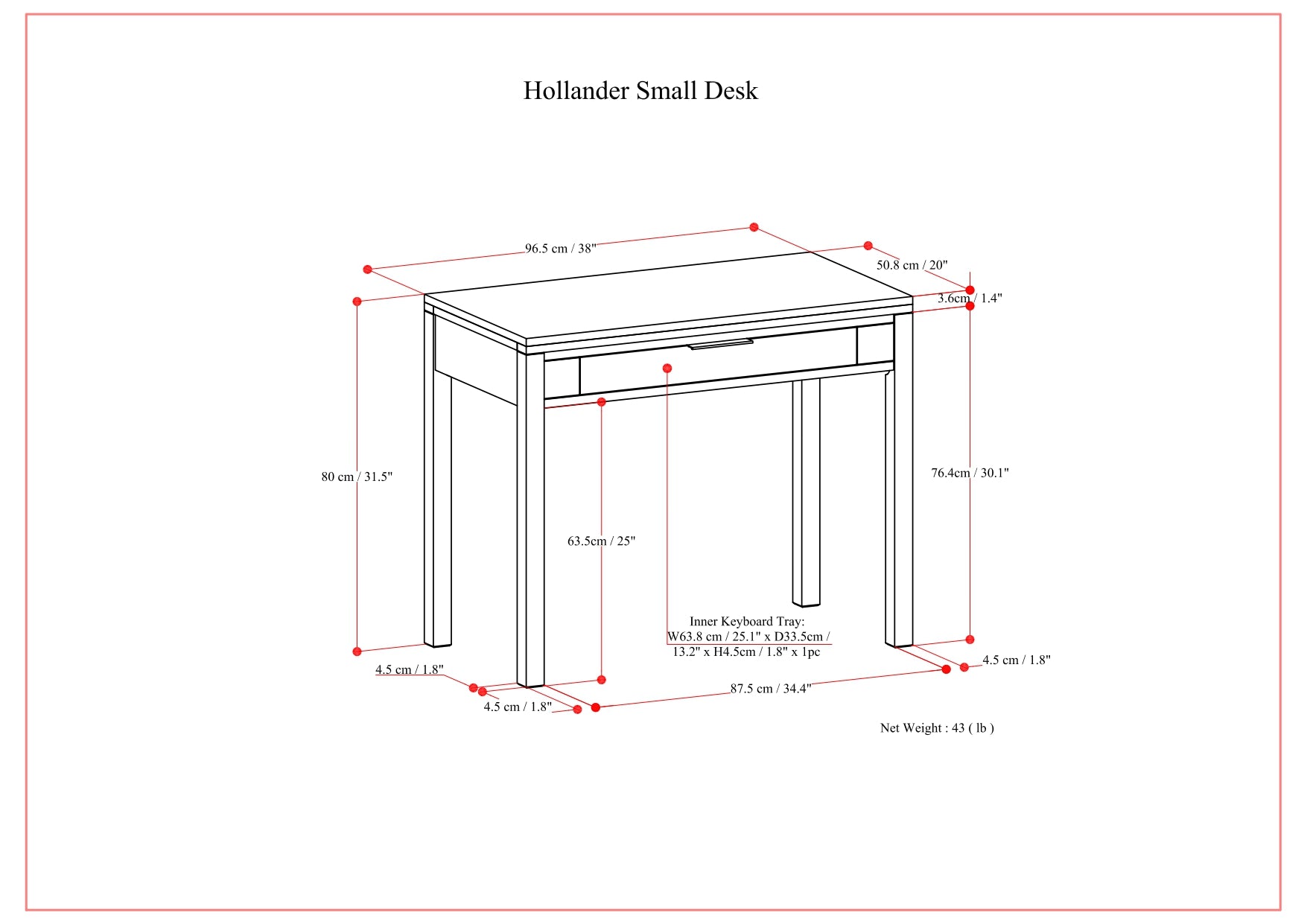 - Storage & organization: One (1) center drawer with flip-down front, ball-bearing drawer glides, and an internal keyboard tray for tidy cable and device management; discreet handle keeps the look streamlined